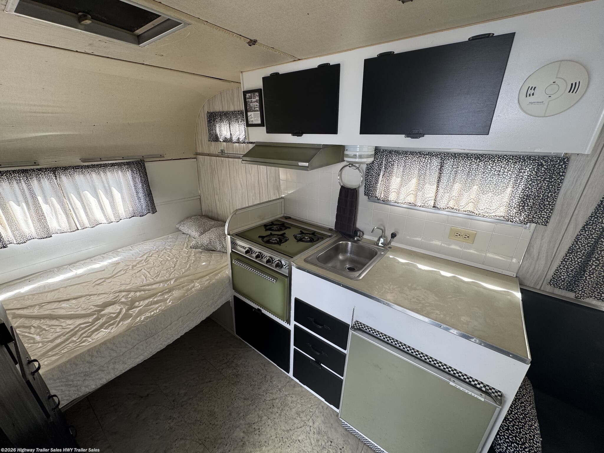 A highly sought-after vintage "canned ham" style camper, often featuring distinctive teal or pastel appliances, birch interior paneling, and a lightweight, durable build from the Oregon-based manufacturer. These trailers are popular for restorations and glamping!