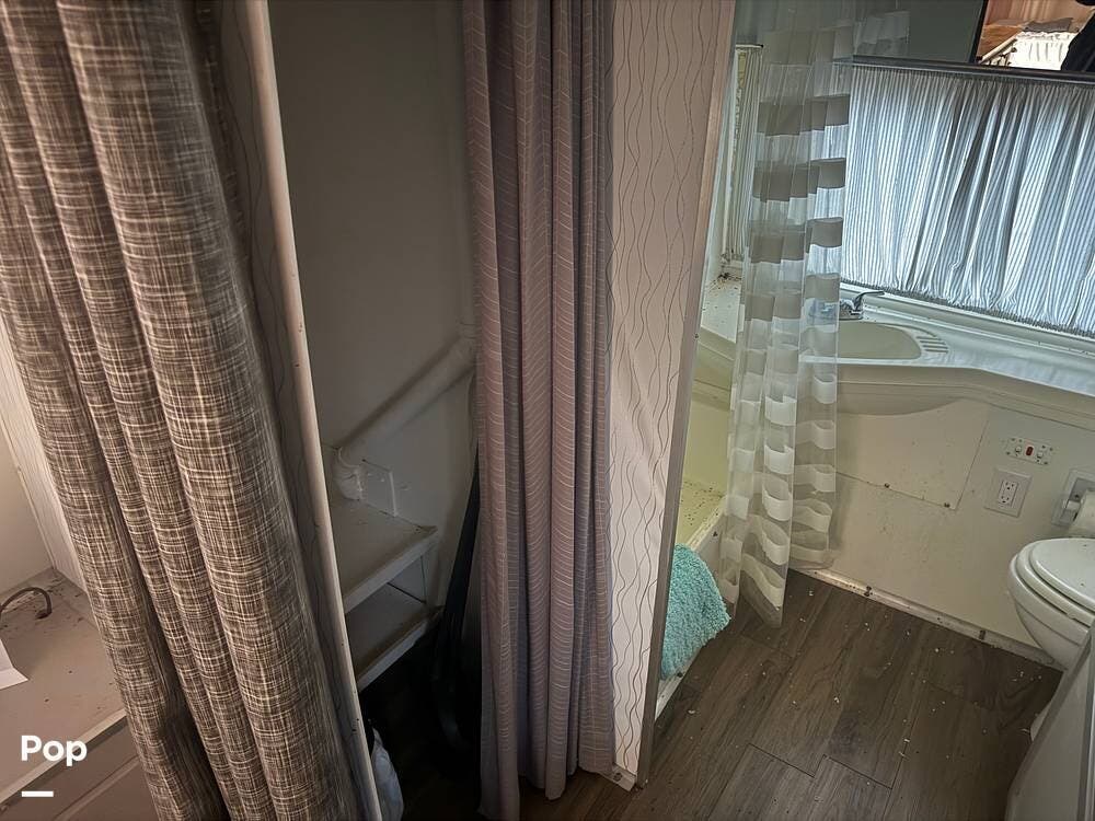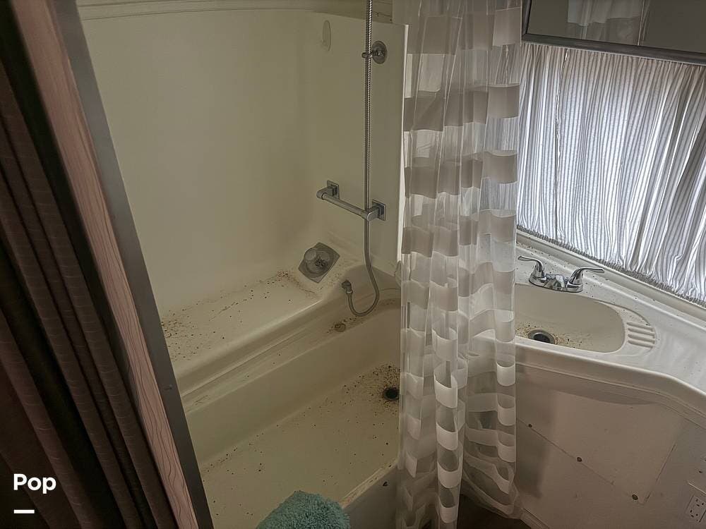 The rear bathroom includes a bathtub, toilet, and sink, separated by a curtain for privacy.