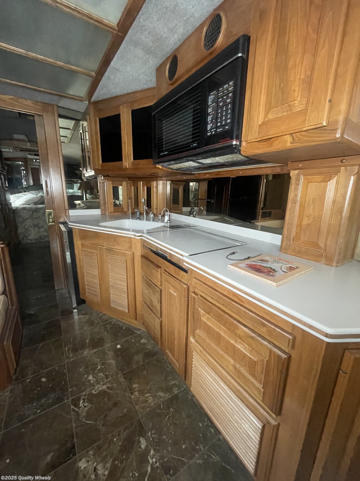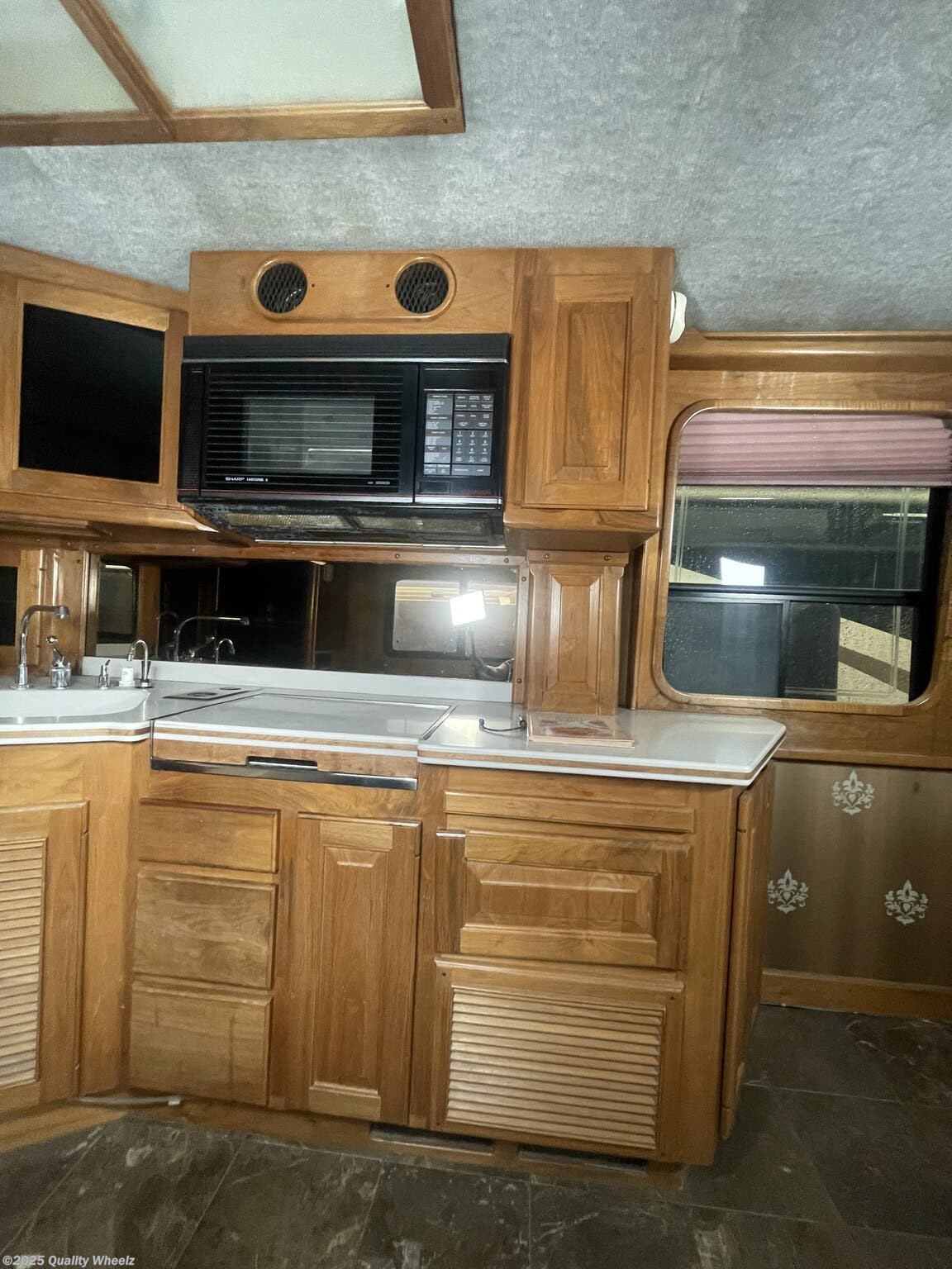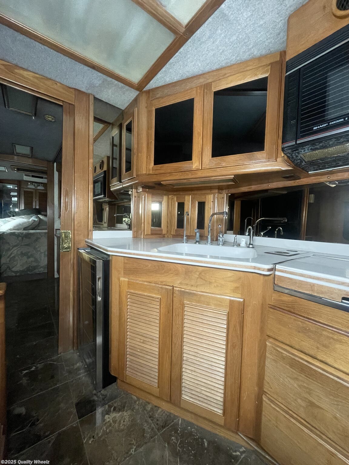 The kitchen in the 1989 Prevost Country Coach Conversion Bus is fully equipped with modern appliances, allowing for convenient meal preparation on the go. It includes a refrigerator, stove, oven, and microwave, as well as ample counter space and storage for kitchen essentials.