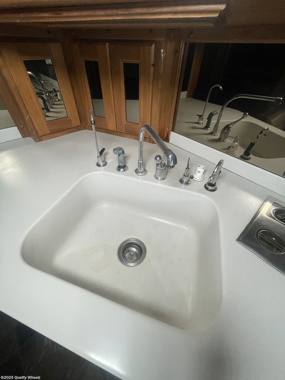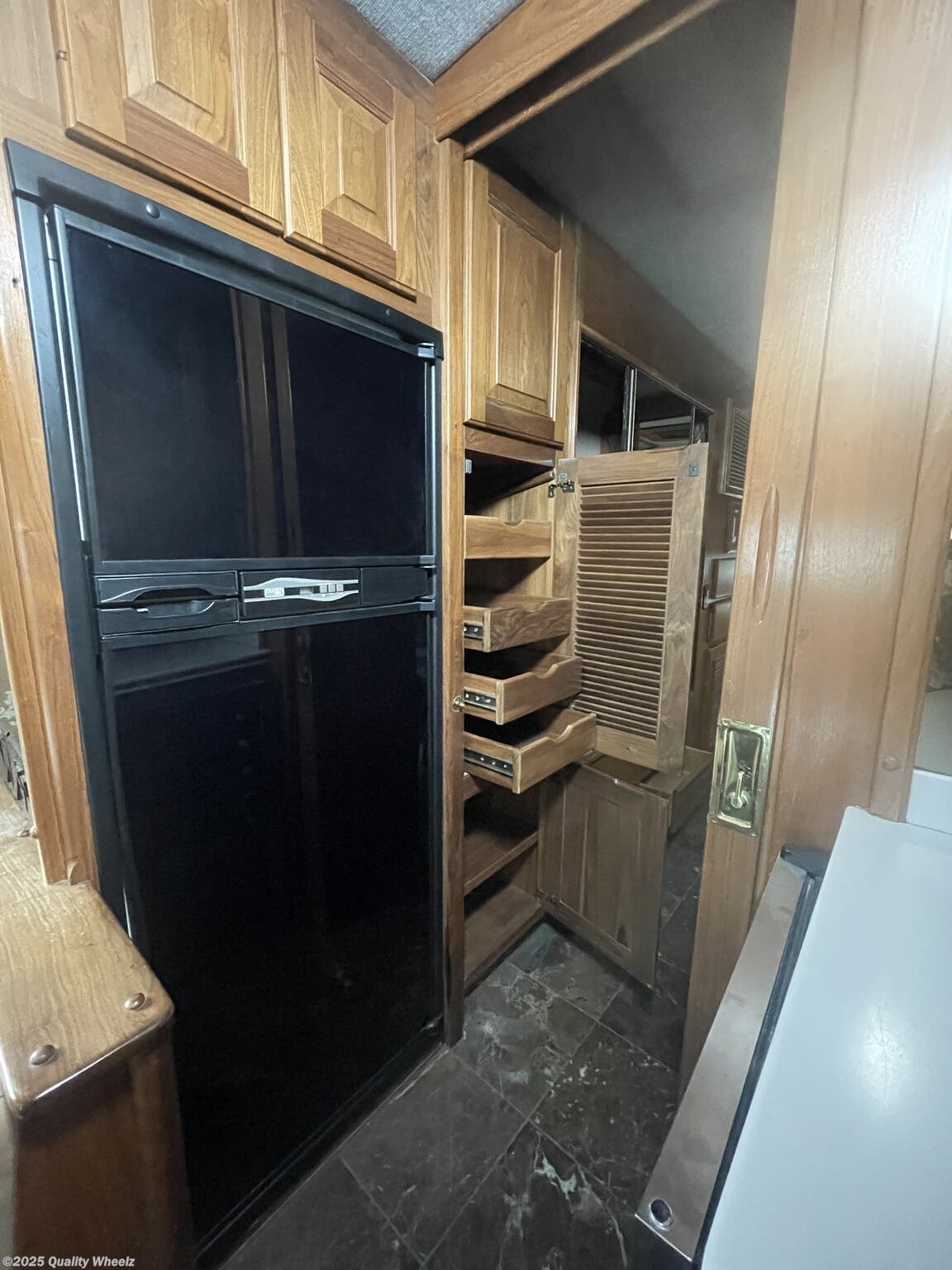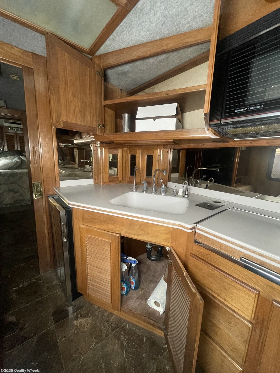 The kitchen in the 1989 Prevost Country Coach Conversion Bus is fully equipped with modern appliances, allowing for convenient meal preparation on the go. It includes a refrigerator, stove, oven, and microwave, as well as ample counter space and storage for kitchen essentials.