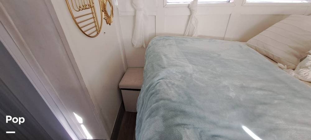 The bedroom has a queen-size mattress, under-bed storage, a dresser, and a TV. A storage closet leads to the rear door, which makes it accessible from the interior or the exterior.