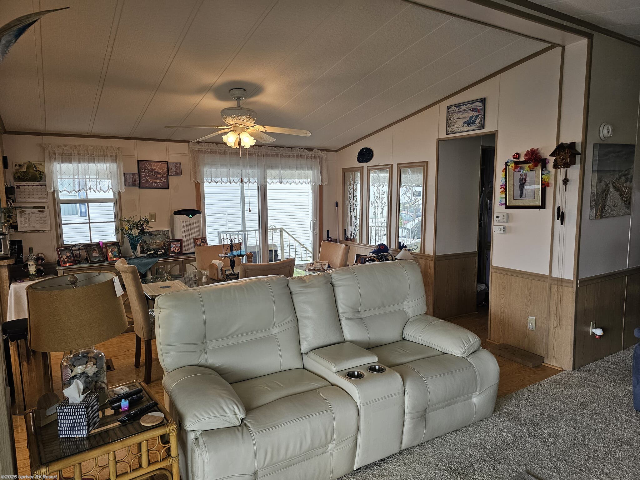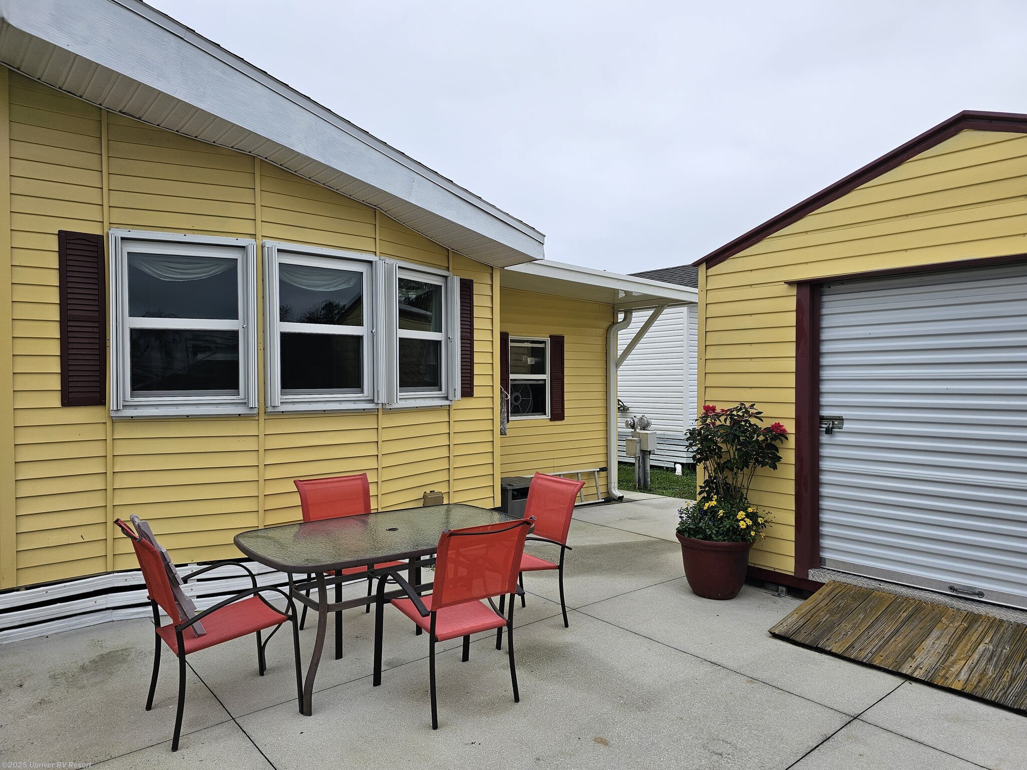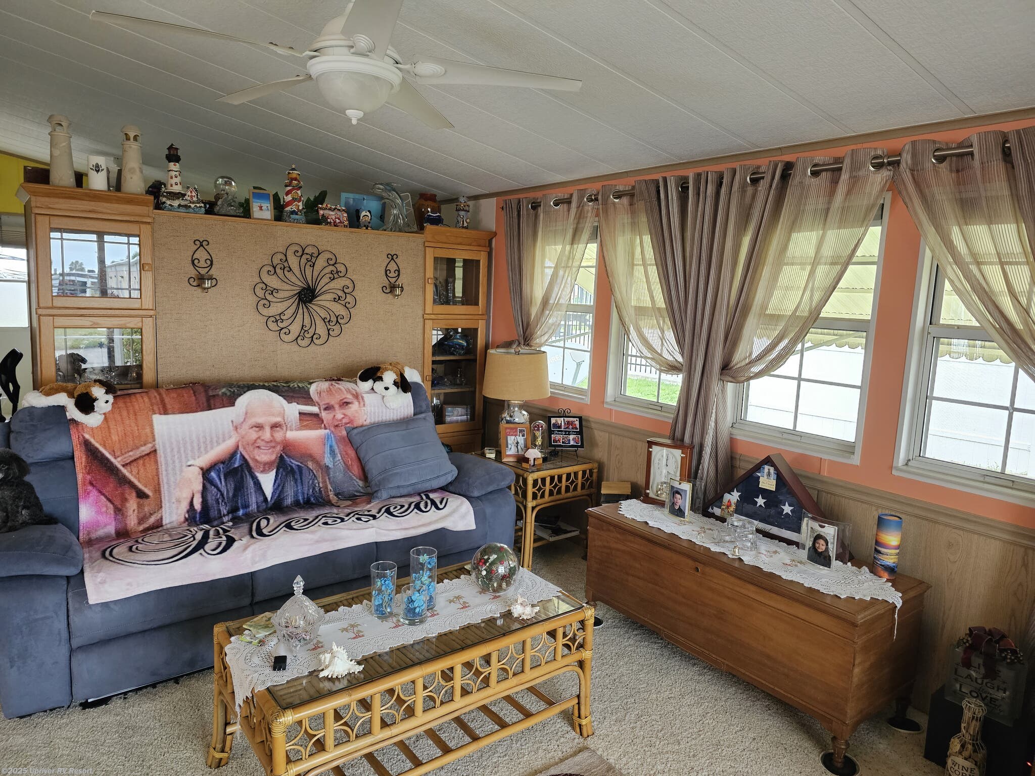 Home is a true double wide on a great site right next to the pools and community recreation hall, it has been meticulously maintained with a new roof, covered front porch with new slider, carport roof 2024 and gutters all around. You'll find it has 2 outdoor sheds, one under carport with washer and dryer and plenty of storage, the 2nd is located behind the home with room for a golf cart and more storage. There is a large patio in back of the home for outdoor sitting, dining or gather for some drinks.