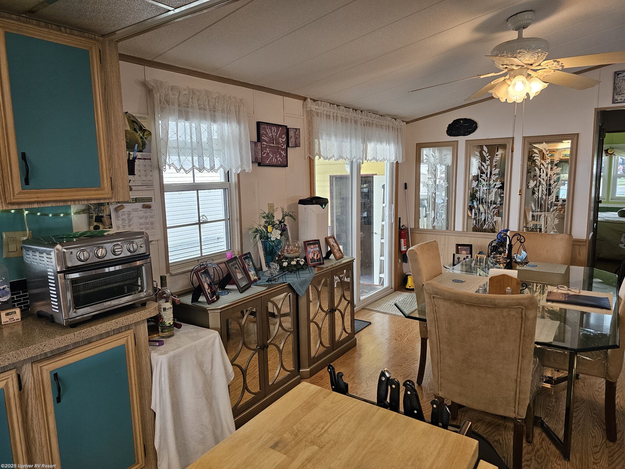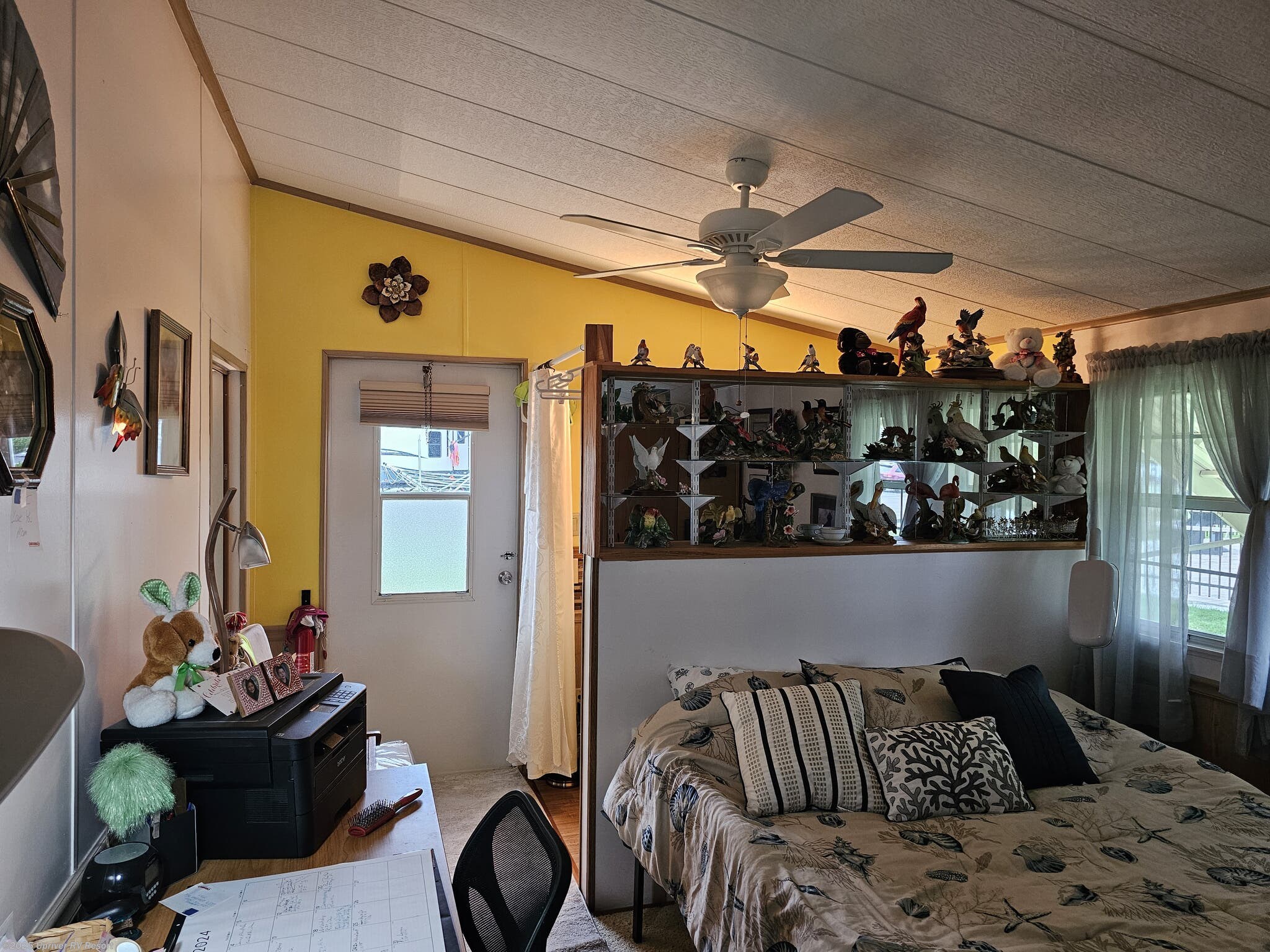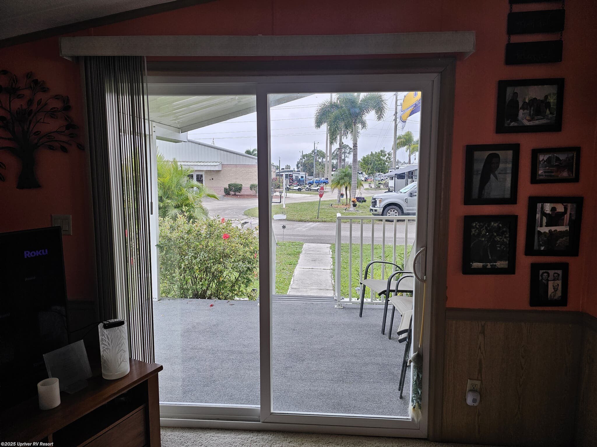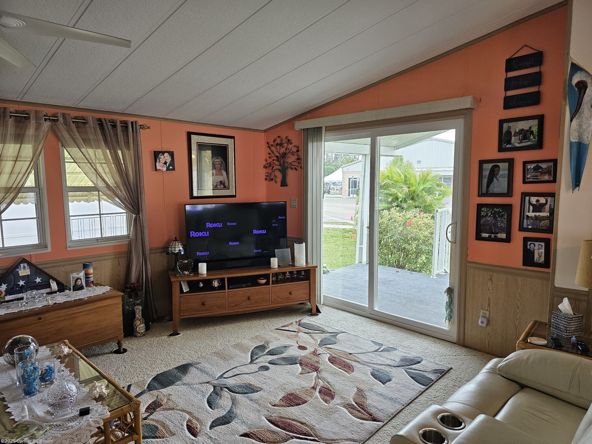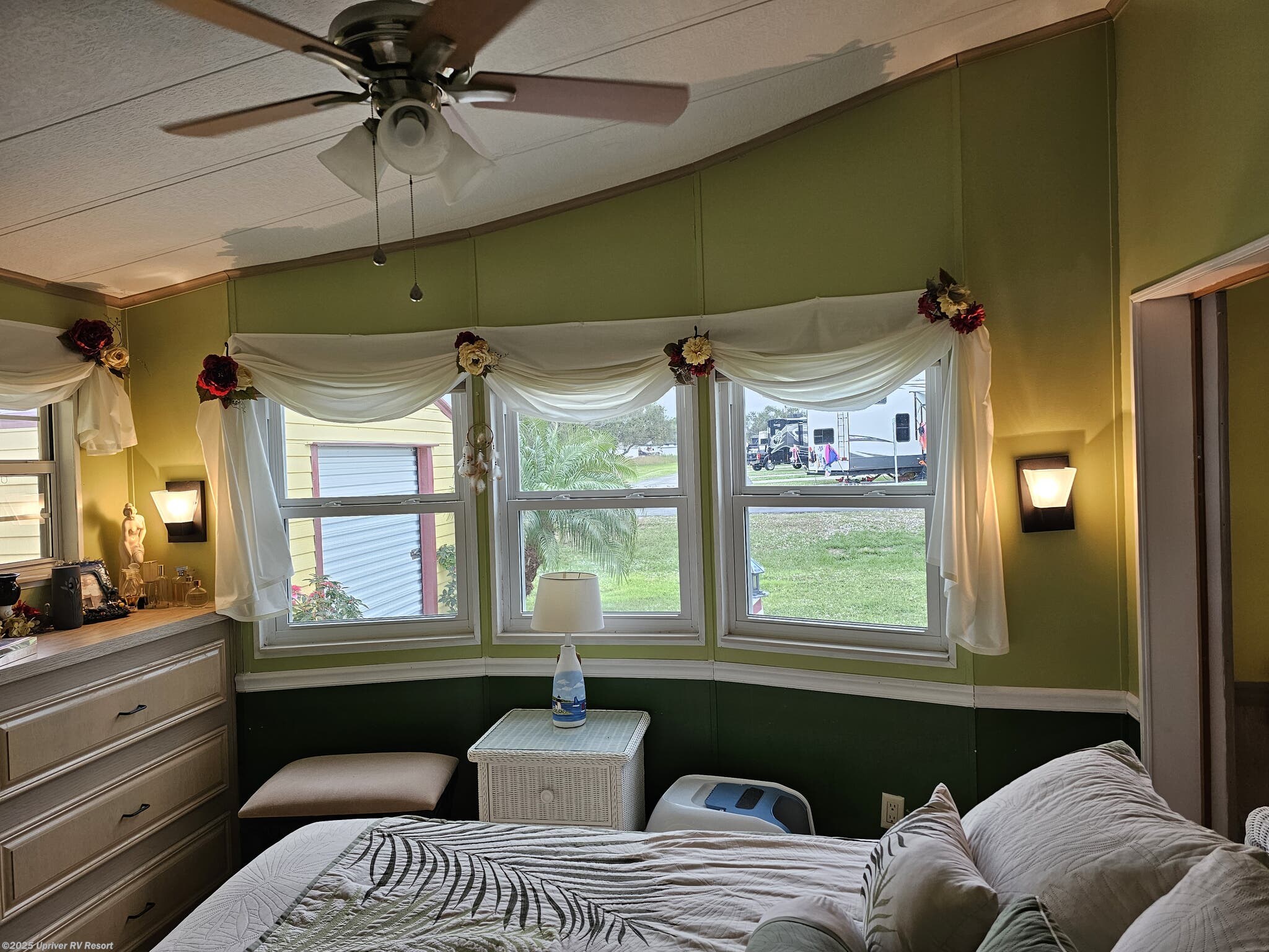 Inside has 1 plus bedrooms, you can either use for a bedroom,den or expand to open up the home more, 1 1/2 baths. Water heater and refrigerator are 5 years old, dishwasher is 4 years old, electric flat top stove with oven and microwave/convection ovens are nes, ceiling fans in every room, A/C 10 years old and maintained twice a year with paperwork,also just installed an ultraviolet light to protect against mold and recently installed a surge protector on it. Home was freshly painted 3 years ago along with new windows in rear bedroom with hurricane shutters, all windows except kitchen tilt inward for easy cleaning. All windows are protected with hurricane shutters. Home will include washer, dryer, front room TV with stand, back bedroom TV on wall, Kitchen Island, and curtains, dining room table and 6 chairs and the bed in primary bedroom. Taking only personal belongings.1991 Chariot Features