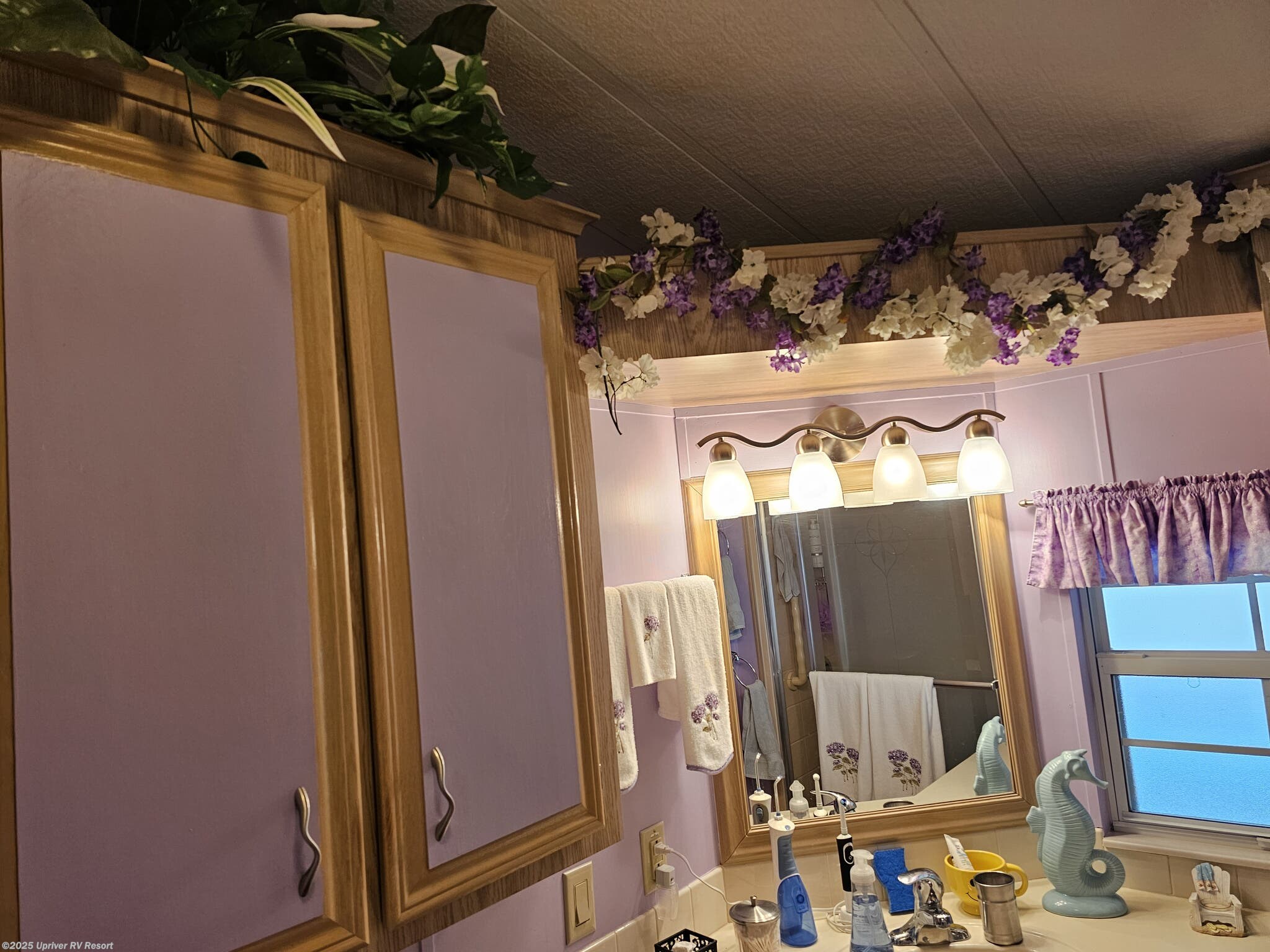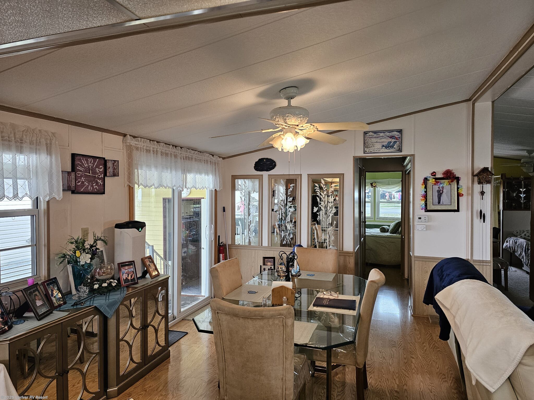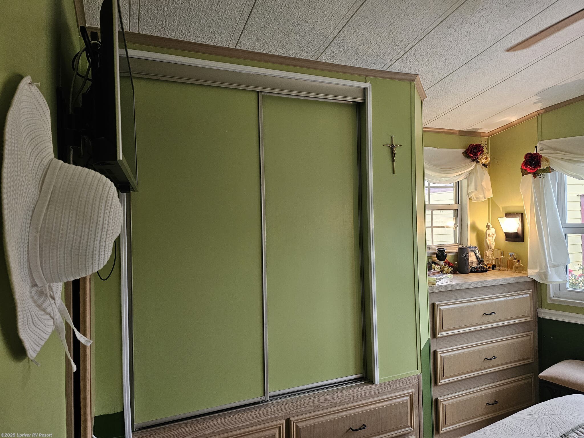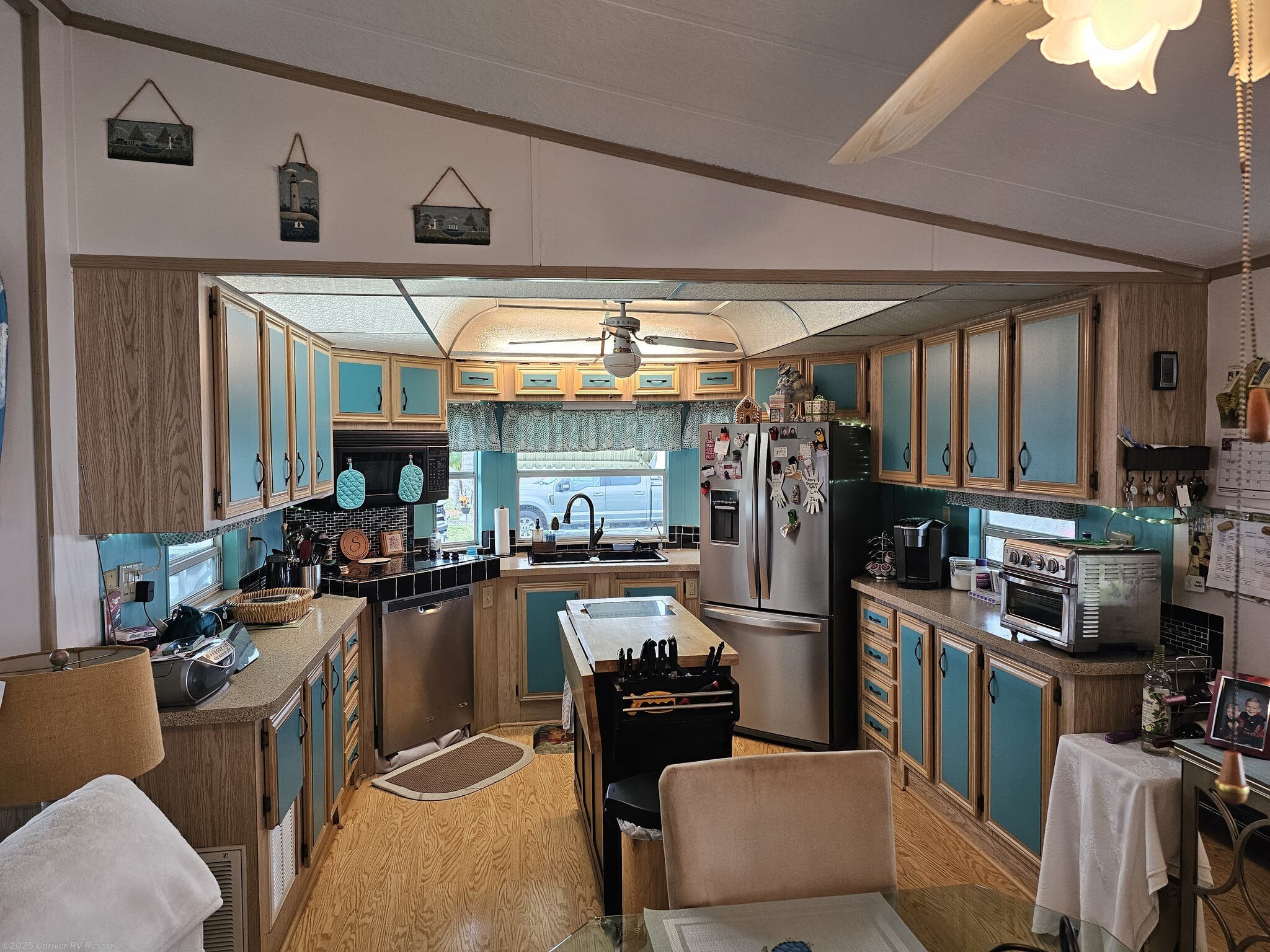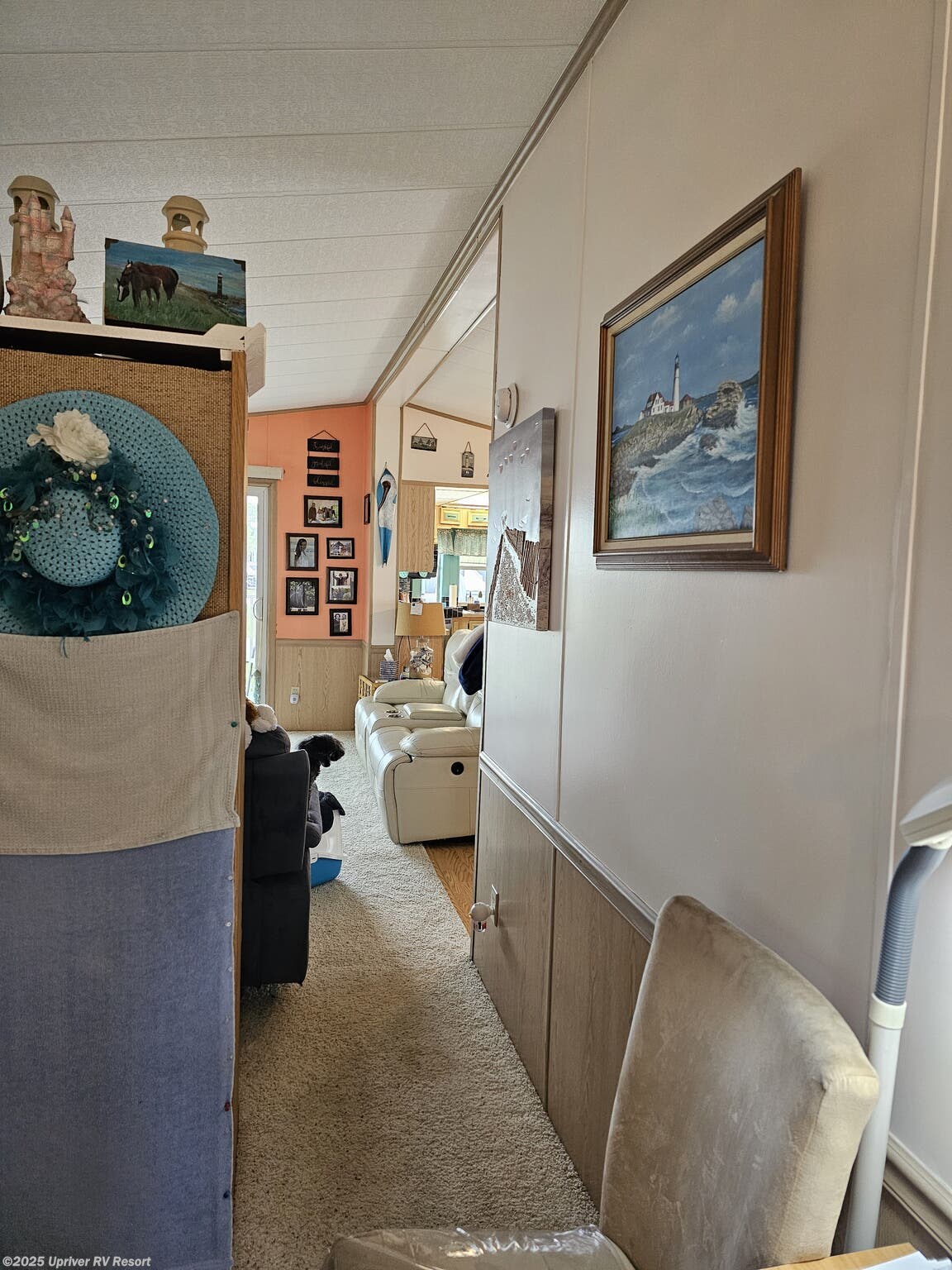 Inside has 1 plus bedrooms, you can either use for a bedroom,den or expand to open up the home more, 1 1/2 baths. Water heater and refrigerator are 5 years old, dishwasher is 4 years old, electric flat top stove with oven and microwave/convection ovens are nes, ceiling fans in every room, A/C 10 years old and maintained twice a year with paperwork,also just installed an ultraviolet light to protect against mold and recently installed a surge protector on it. Home was freshly painted 3 years ago along with new windows in rear bedroom with hurricane shutters, all windows except kitchen tilt inward for easy cleaning. All windows are protected with hurricane shutters. Home will include washer, dryer, front room TV with stand, back bedroom TV on wall, Kitchen Island, and curtains, dining room table and 6 chairs and the bed in primary bedroom. Taking only personal belongings.1991 Chariot Features