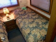 Come in through the side door and you'll find yourself in the middle of the living area. There's a convertible sofa, a recliner seat, and plenty of overhead cabinet space. To your right, you'll find the driving station, with an overhead entertainment center. Turn left and you'll find the kitchen area with a fully equipped galley and a convertible dinette. The kitchen is equipped with solid wood cabinetry, hardwood flooring, Corian countertops, 3-burner stove, oven, coffee maker, microwave, double sink and refrigerator/freezer. Continue walking towards the back of the RV and you'll find a solid wood (cedar lined) closet to your right and a full size bathroom to your left. The bathroom comes equipped with a toilet, sink, cabinet and tub shower. Continue walking towards the back and you'll find a bedroom with two twin-size beds, a nightstand, overhead cabinetry and a TV.
