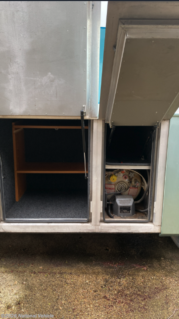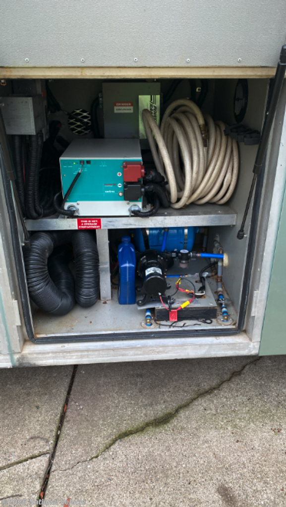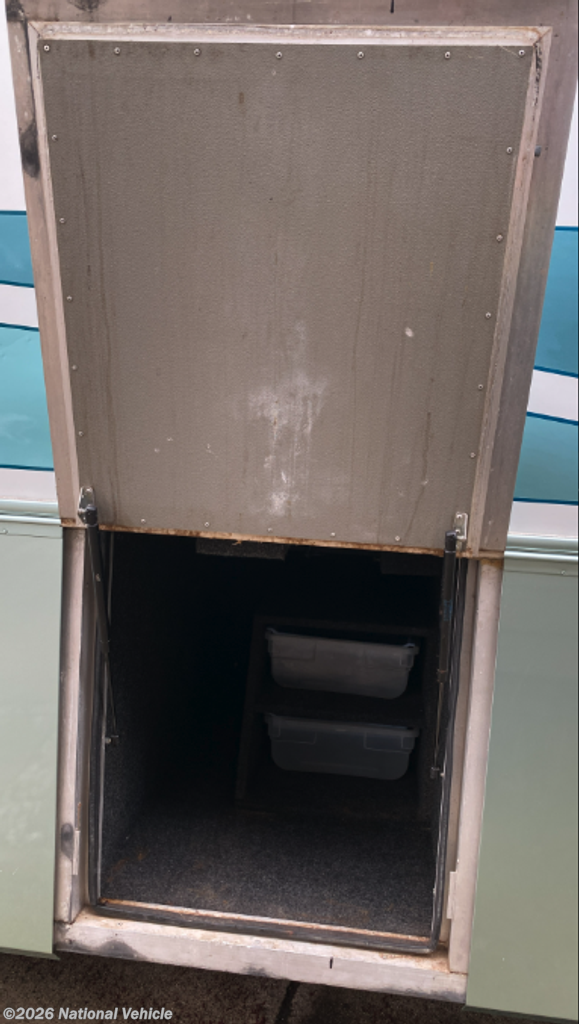 This coach is also equipped for extended stays and off-grid capability with a generator, 50-amp service, and a reliable Pac brake system for added control when driving in varied terrain. Basement storage bays are in working condition, providing generous space for gear and travel essentials.