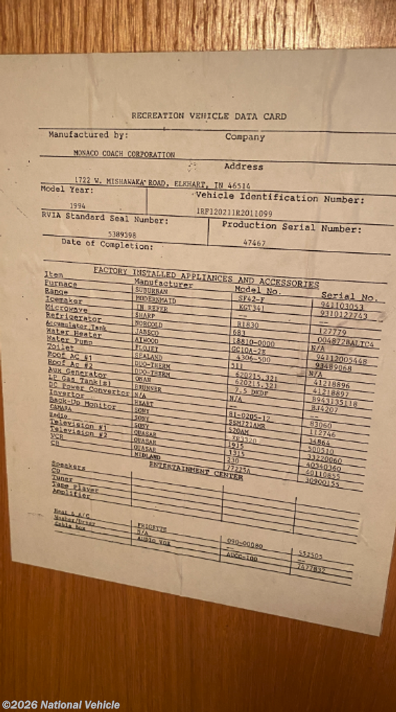 Request More Info on this 1994 Monaco RV Dynasty Offered for sale by National Vehicle
