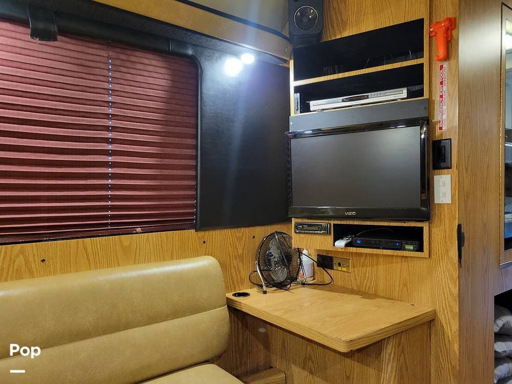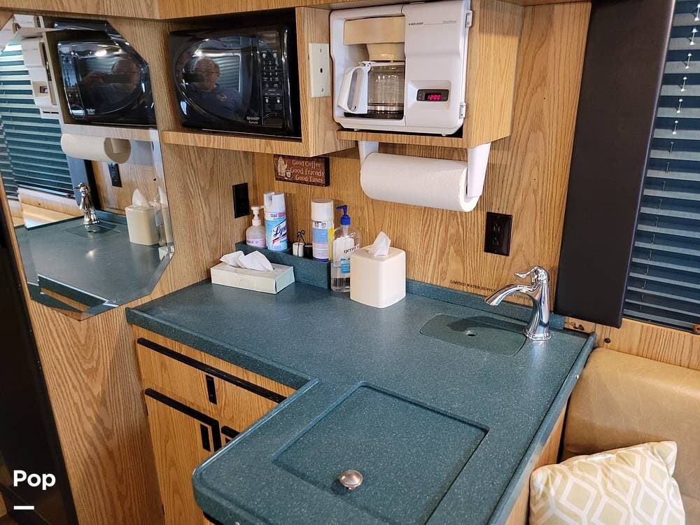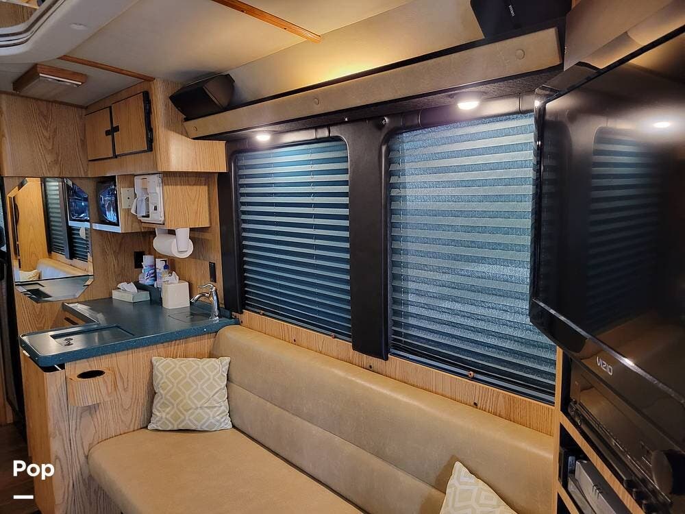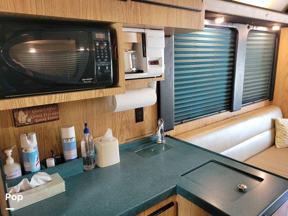 She has a kitchen with a microwave, sink, refrigerator with a freezer, dinette, and plenty of counter and cabinet space. She also has, in addition to the 12 beds, a 1/2 bath and a rear lounge area.