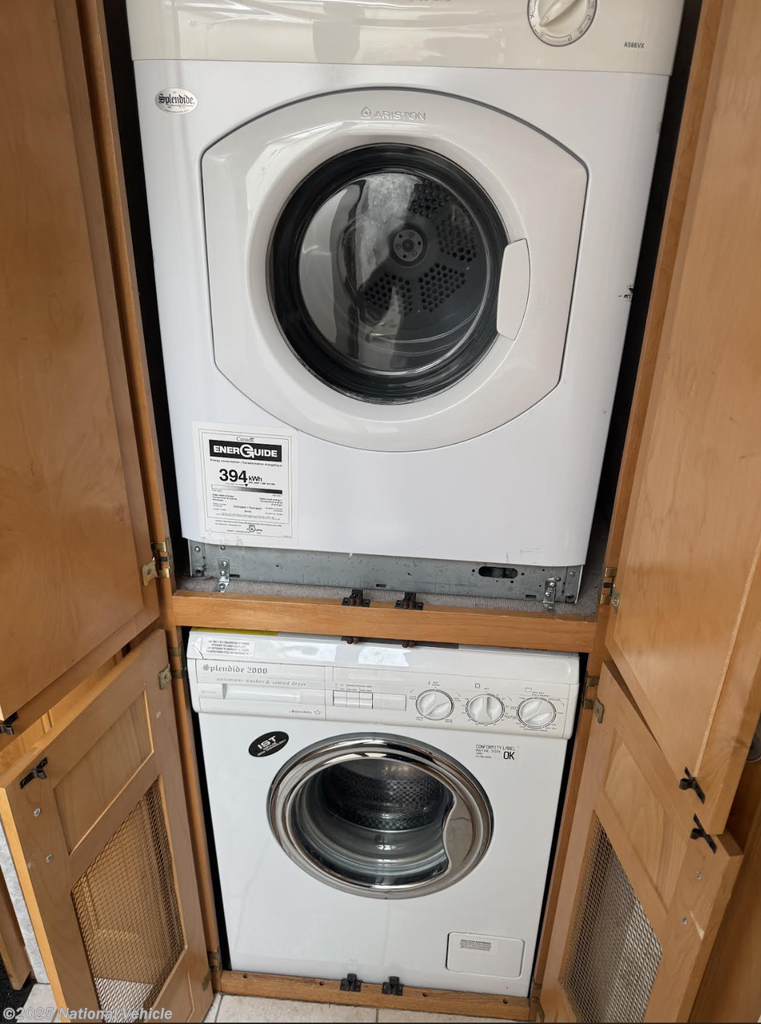 The private bedroom includes a queen bed, large wardrobe, and TV, while the split bathroom features a corner glass shower, vanity, and enclosed toilet. A washer and dryer add the convenience of home while on the road.