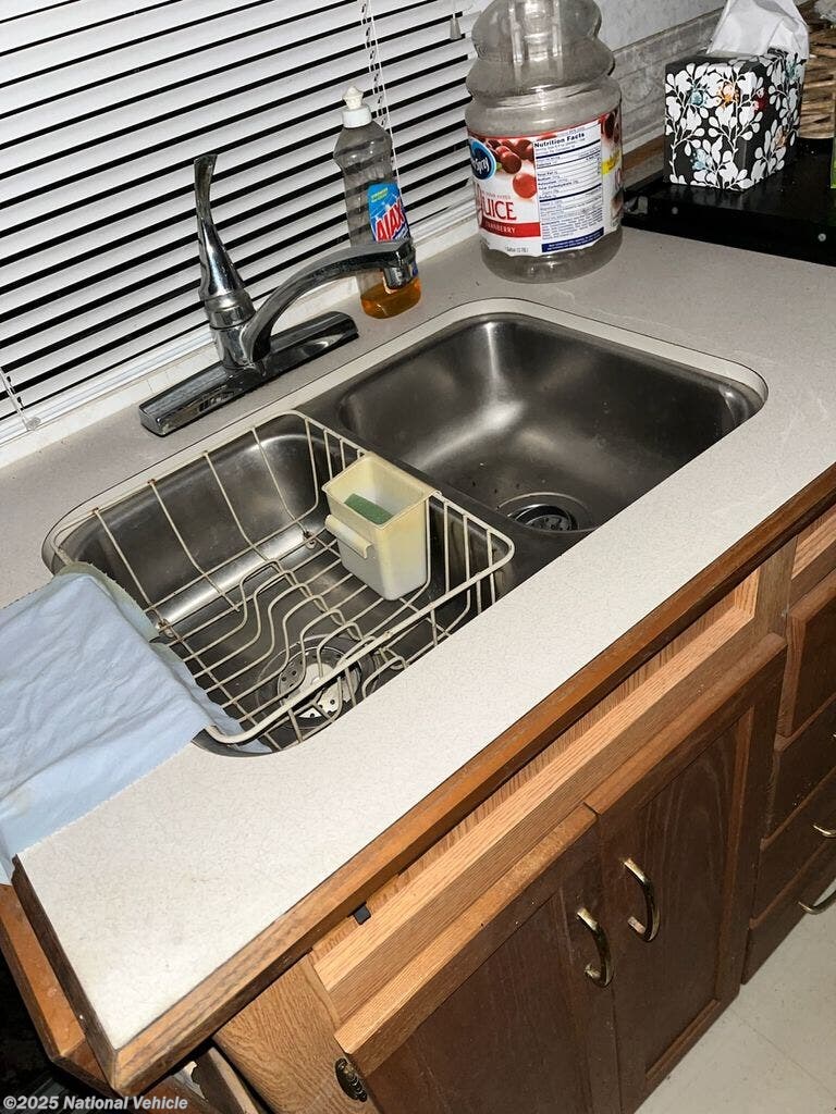 Step inside to a bright, open living space designed for comfortable daily use. The front living area features a spacious sofa and convertible dinette?perfect for relaxing, dining, or hosting guests. Large windows fill the coach with natural light, giving the interior a warm and inviting feel. The thoughtfully arranged kitchen includes a three-burner cooktop, oven, microwave, refrigerator, double sink, and plenty of cabinet space, allowing you to prepare meals with ease.