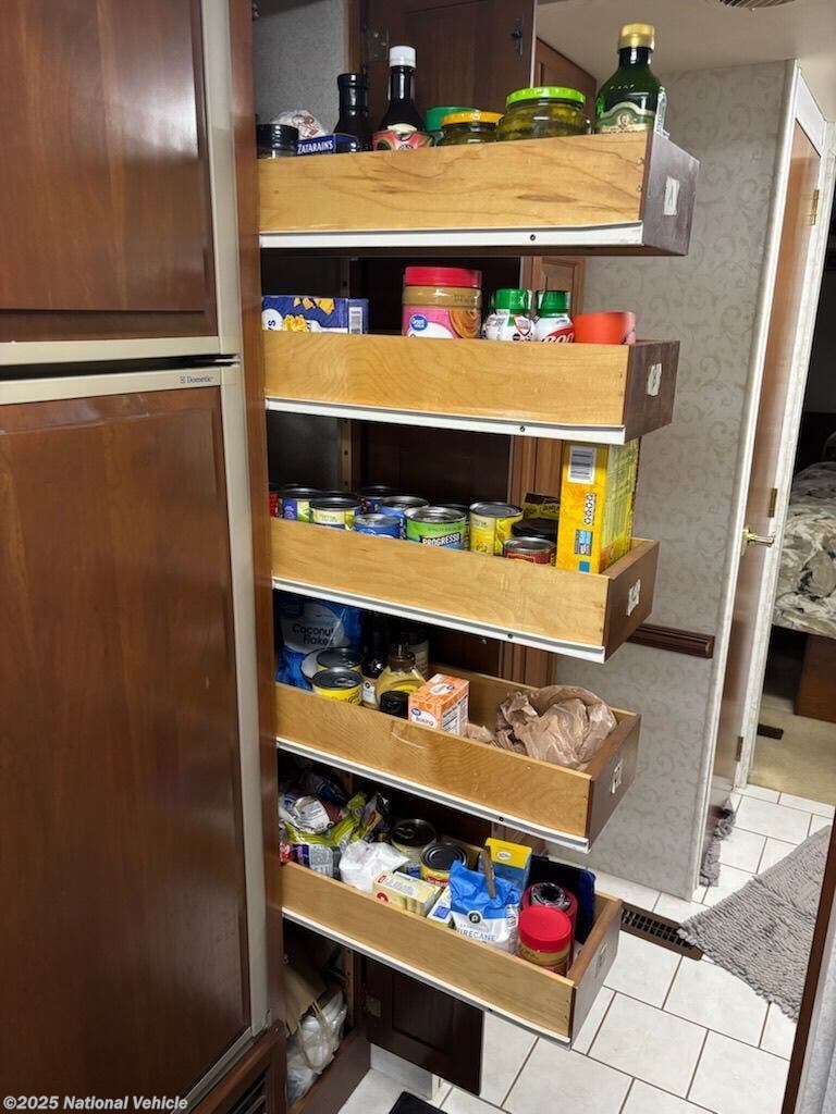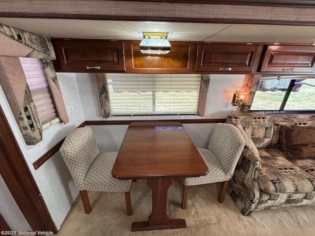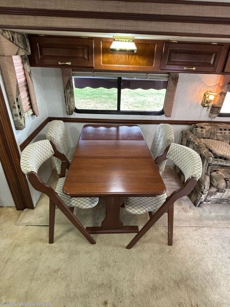 The Dutch Star line is known for its solid construction and residential comfort, and this coach is no exception. Inside, the spacious layout features two slide-outs, a large sofa, recliner chair, and table dinette creating a welcoming living space that still holds up beautifully today. The dinette set also includes a table leaf and 2 matching folding chairs stored in a separate compartment. The kitchen is well-appointed with Corian countertops, a three-burner stove, new Whirlpool microwave/convection oven, double sink with covers, and a refrigerator/freezer? plenty of room and function for extended stays. It has an external pull-out refrigerator/freezer that makes long term frozen storage or, outside entertaining easy.