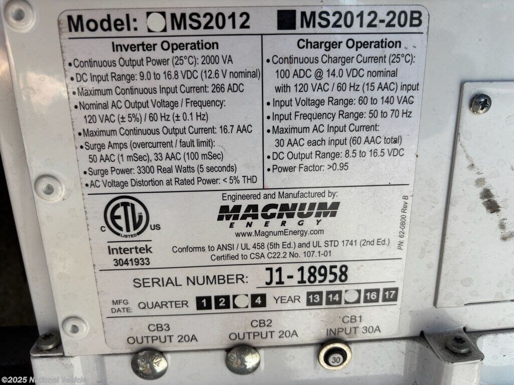 - Magnum MS2012 Inverter: 2,000 watts continuous; 30 second surge 3,100 watts. Pure Sine Wave inverter installed by Newmar see picture