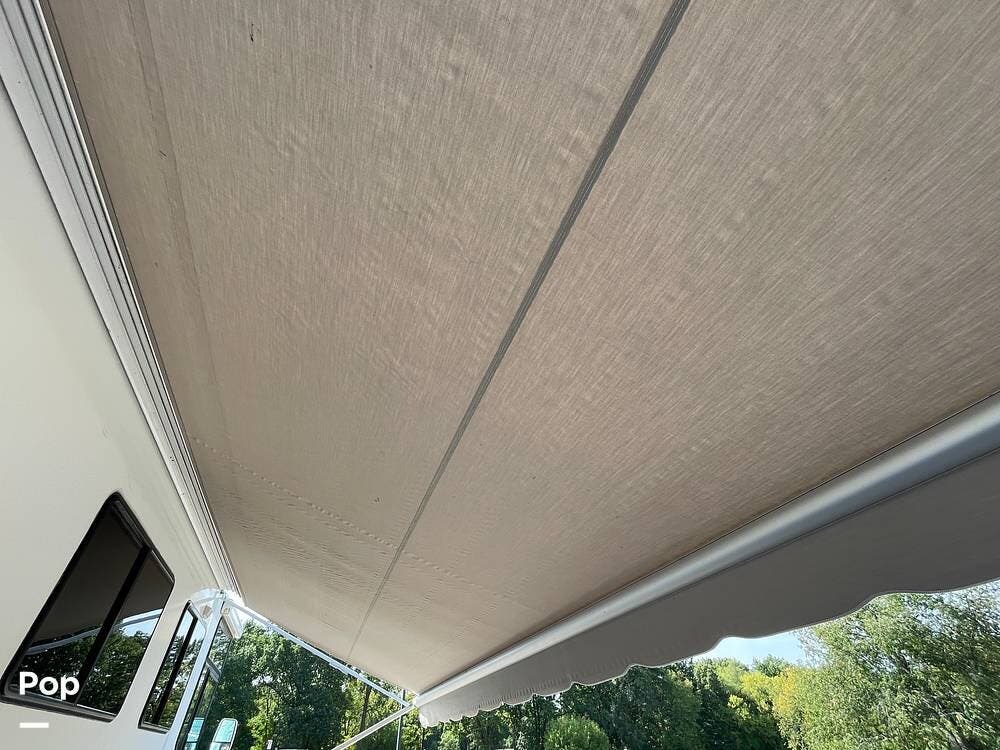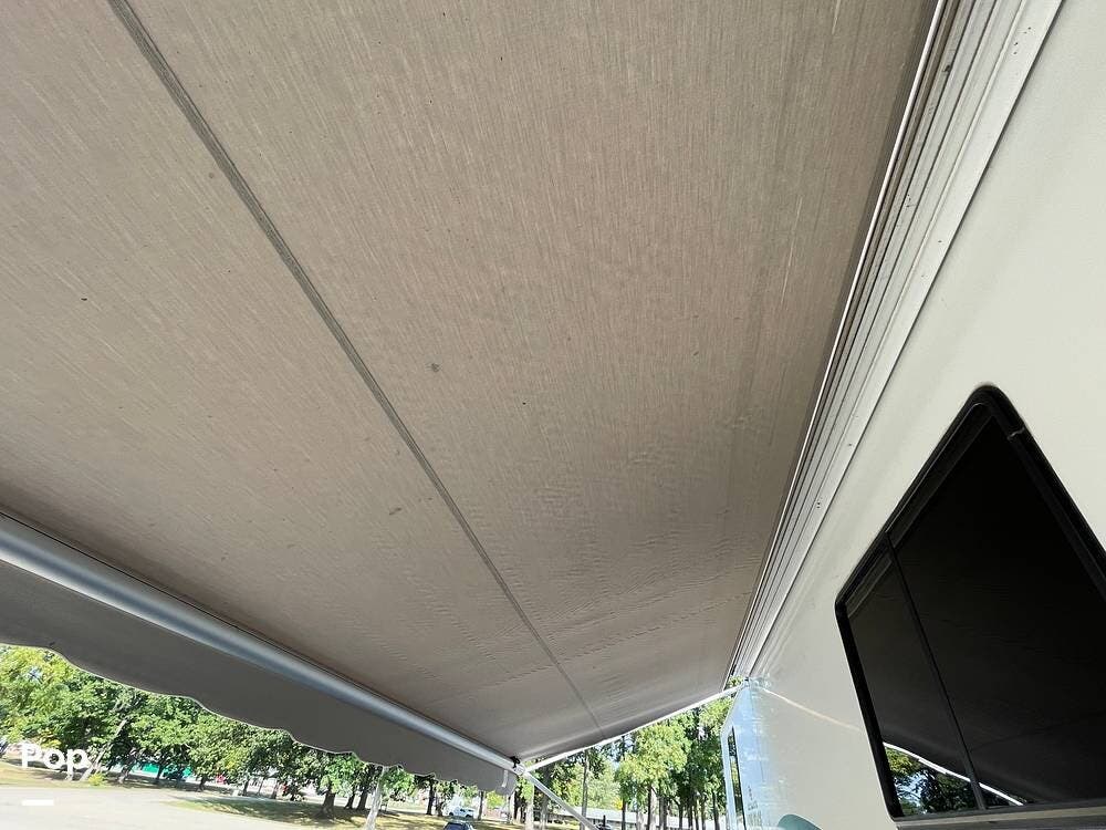 The exterior features a manual patio awning, an entry door awning, a roof ladder, an external stereo with speakers, a mud flap, and an expansive amount of storage.