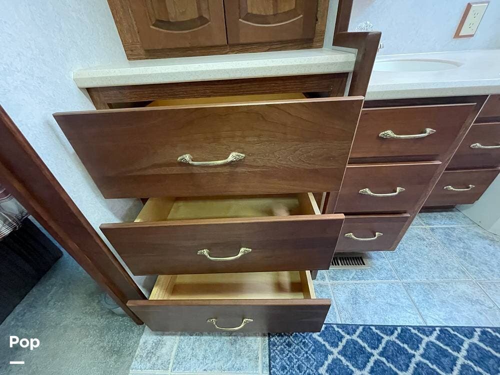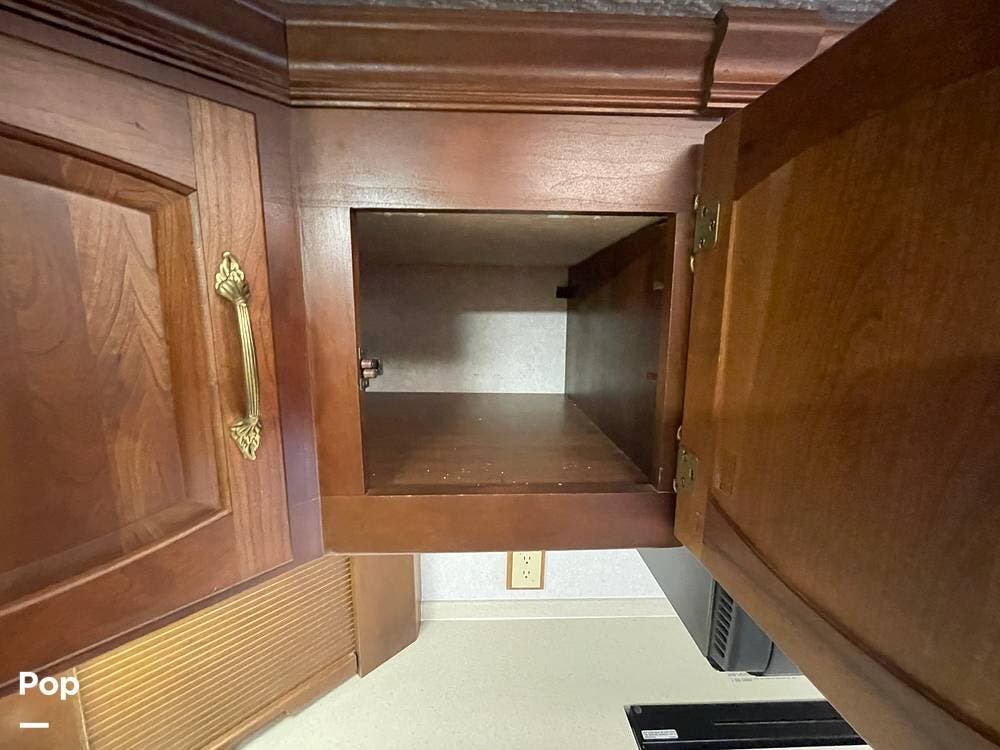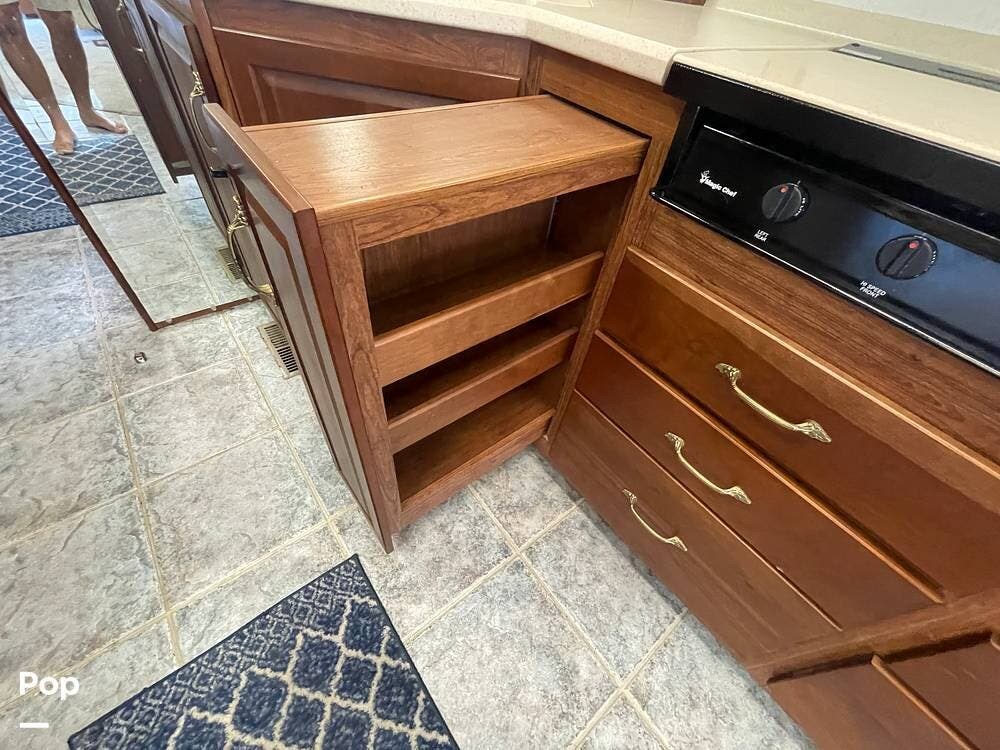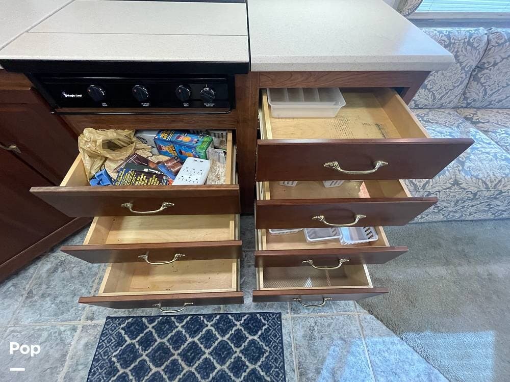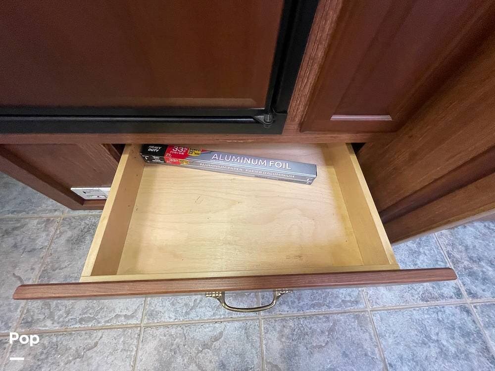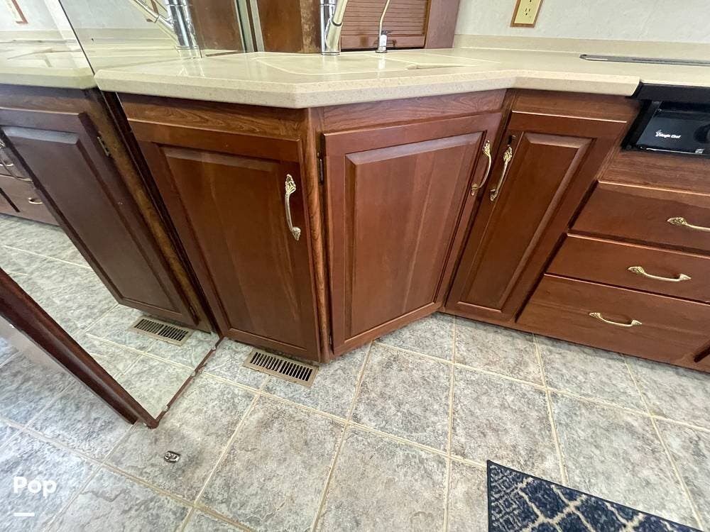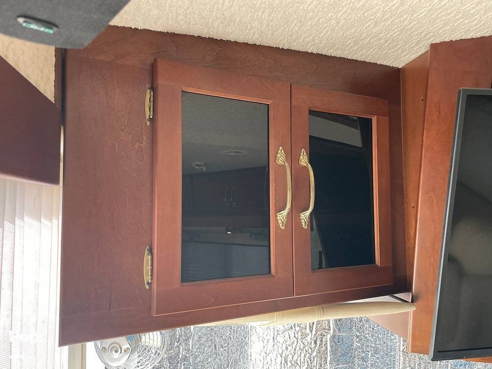 The Interior of the coach features solid wood dovetailed cabinet drawers, slide and rail cabinet door with raised panel inserts, solid surface countertops, and premium flooring.