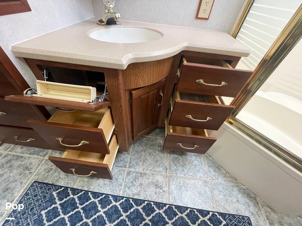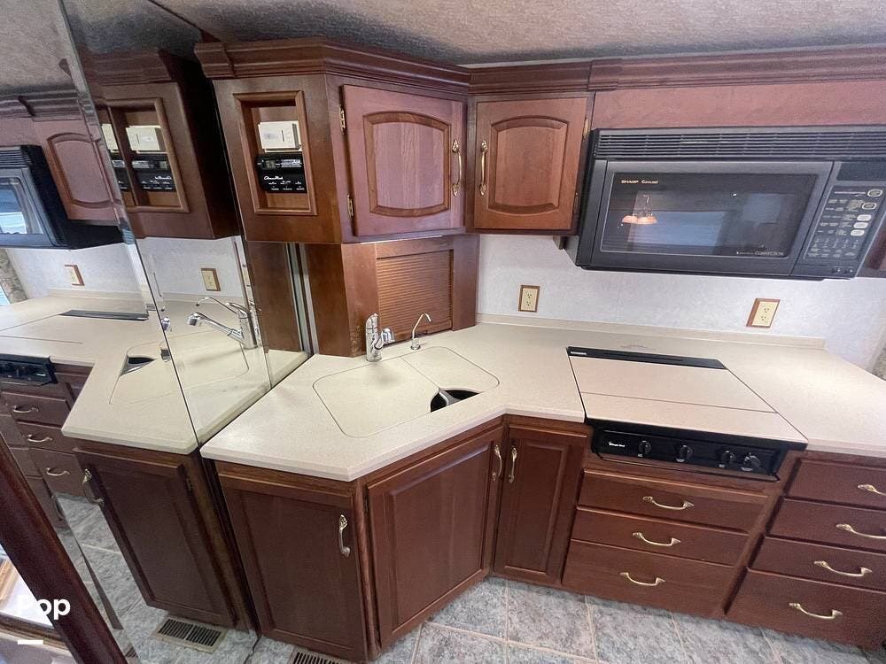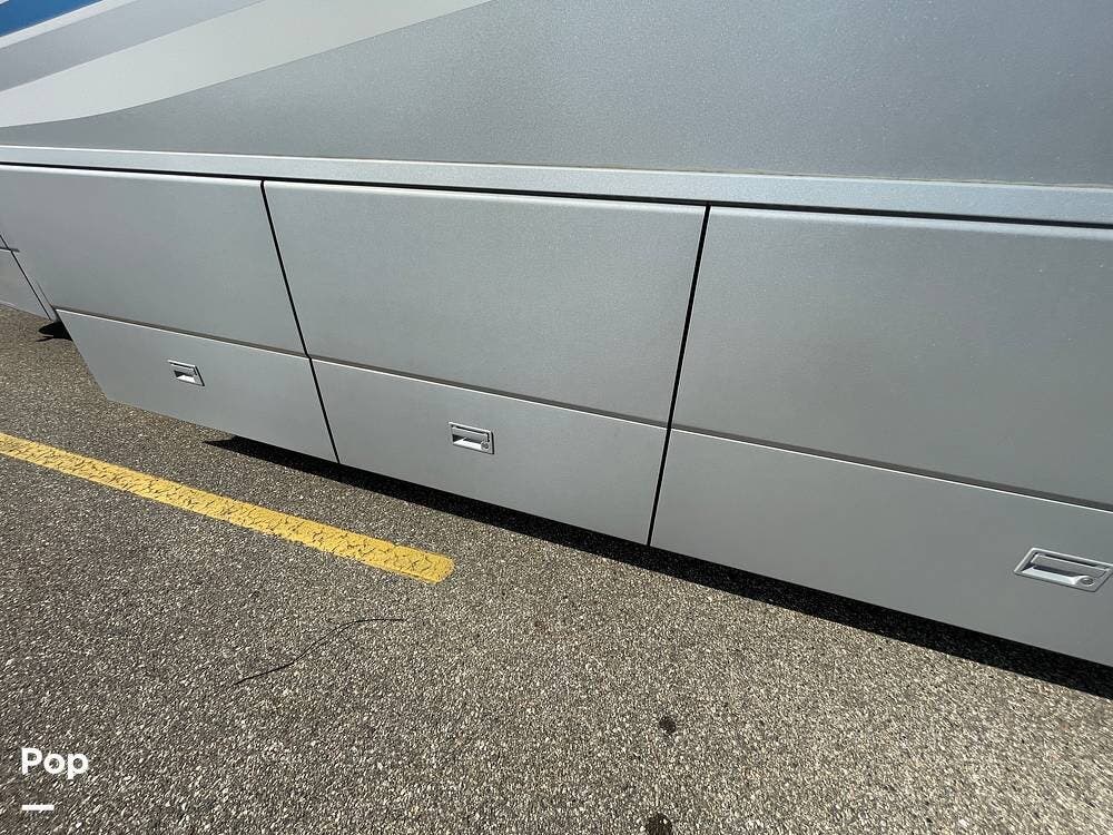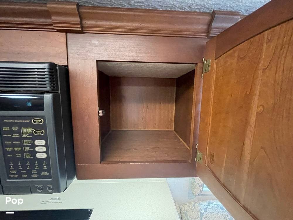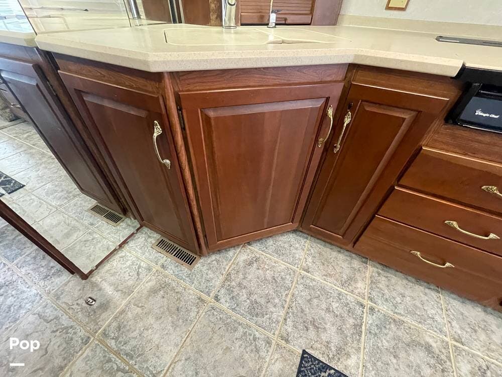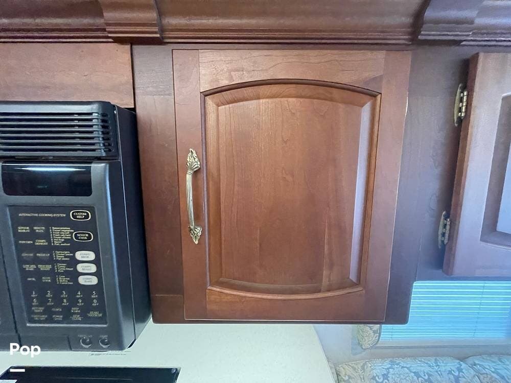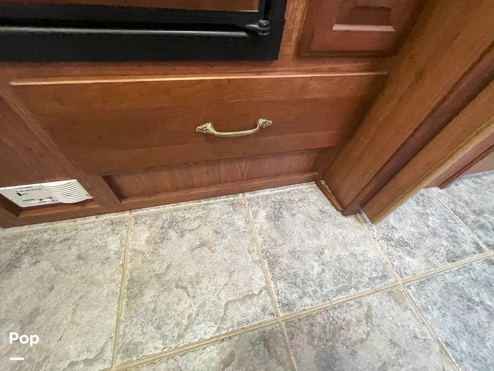 The Interior of the coach features solid wood dovetailed cabinet drawers, slide and rail cabinet door with raised panel inserts, solid surface countertops, and premium flooring.