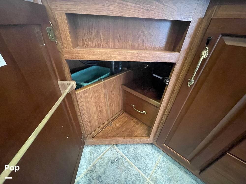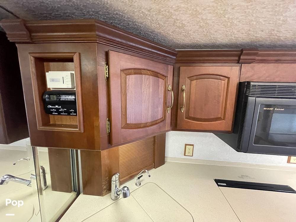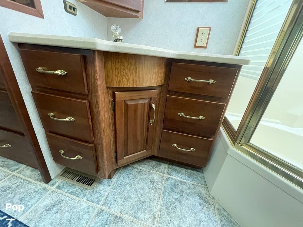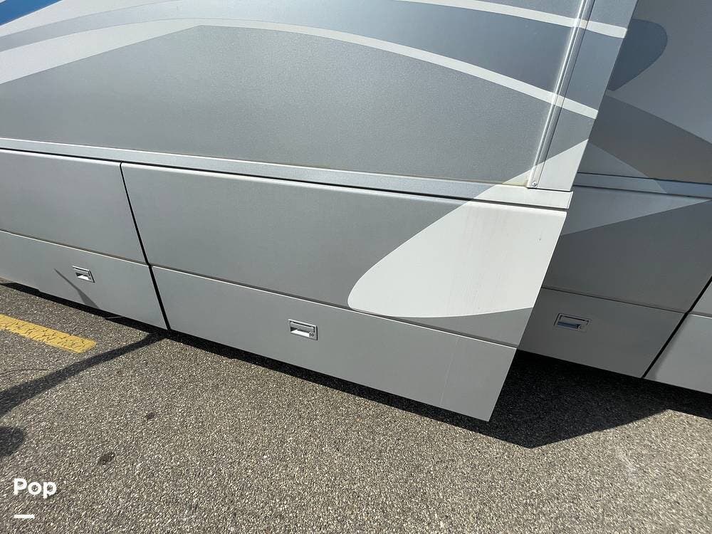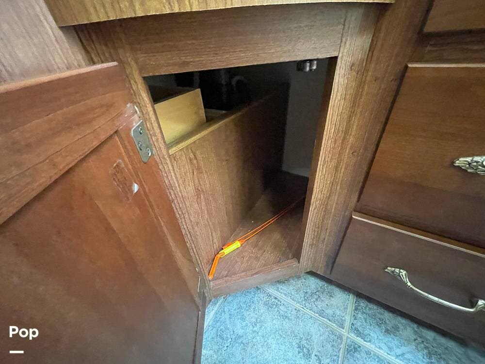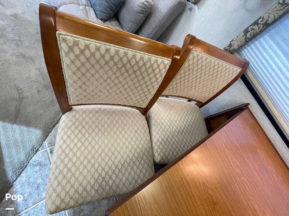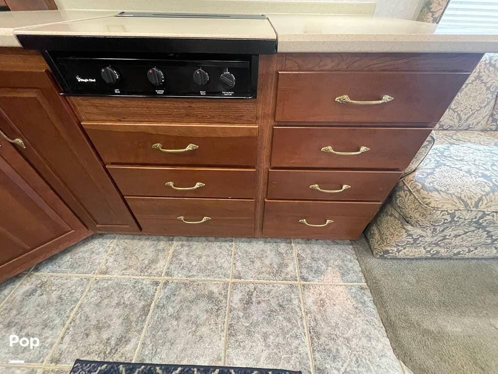 The Interior of the coach features solid wood dovetailed cabinet drawers, slide and rail cabinet door with raised panel inserts, solid surface countertops, and premium flooring.