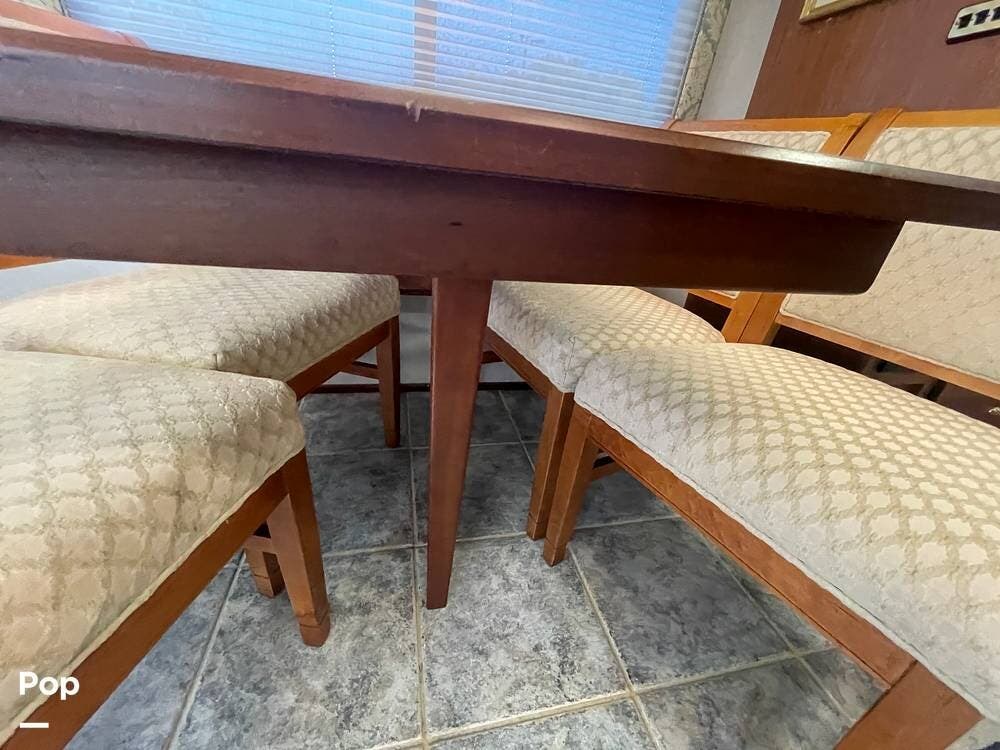 Beyond the sofa chair is the dining table, complete with a leaf and four stand-alone chairs, providing maximum seating comfort. Above the table are decorative lighting and overhead storage cabinets.