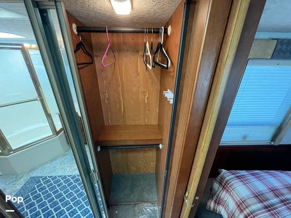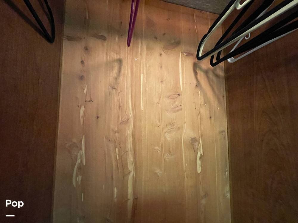 Just before the bedroom entryway, a large cedar-lined wardrobe closet with mirror sliding doors is located.