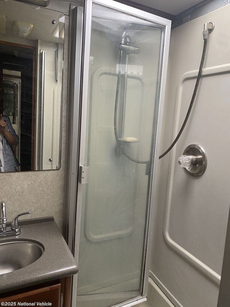 This coach features a bathroom complete with shower, toilet, and a sink with a medicine cabinet above for your convenience.