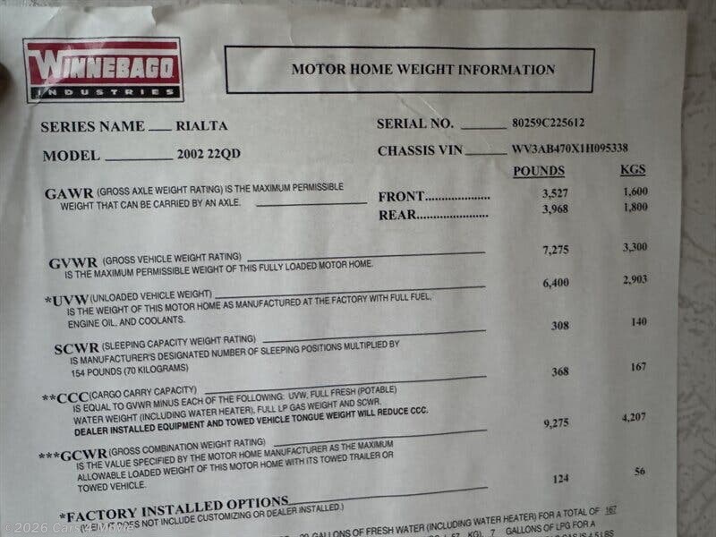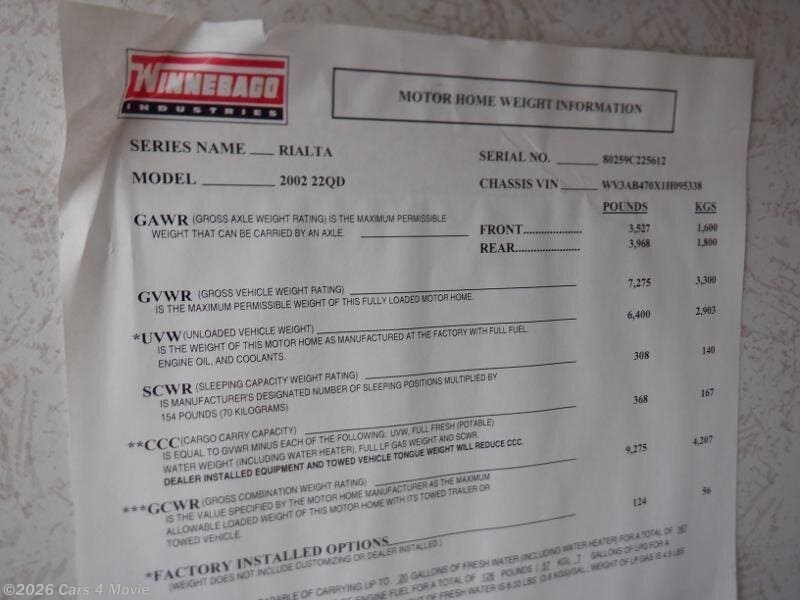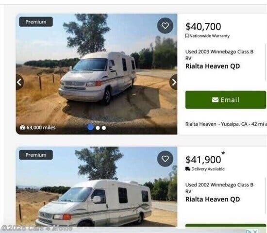 2026 is shaping up to be a great year for Happy campers. We are a family-run business specializing in RVs and specialty vehicles, proudly selling nationwide since 2010 with 100% positive eBay feedback and thousands of satisfied buyers. Every unit completes a 50-point inspection focused on safety, reliability, and overall condition, then is stored in a secured private facility (not a public car lot) until sold. Over 95% of our customers purchase sight-unseen with confidence through our simple, transparent process, which includes FREE nationwide shipping and a 30-day limited warranty, with live FaceTime video call available so buyers can verify authenticity and condition in real time before finalizing the wire. Our family has pioneered RV FREE shipping coast-to-coast for over 14 years, earning a reputation built on trust, transparency, and hassle-free delivery. Rialta 22QD is one of those rare RVs that has become a cult classic, and its popularity continues to rise even years after production ended. My best low miles; Driven less than 2,000 miles a year. no accident no flood CLEAN TITLE CLEAN CARFAX WITH CUSTOM INTERIOR CONVERSION ($5000) for more living space the middle seats are available has roof AC, 3-new batteries, new silent generator, new fresh paint on rear bumper & panels, new tv dvd combo, new backup camera, new oil filter service, recent heavy duty commercial tires, whoever buys this one will end up with my best. The 2002s with new improved more H.P. Winnebago Rialta 22QD remains one of the most sought-after Class B+ motorhomes ever built, and for good reason. The airplane like aluminum body roof is light & rust leak proof, At just 22 feet long, it strikes the perfect balance between comfort and convenience—small enough to handle like a van, yet spacious enough to provide all the amenities of a larger RV. sleeps 2 adults Built on the dependable VW Eurovan chassis with the smooth VR6 engine, this Rialta offers superior maneuverability u can even take it to drive throughs, excellent fuel economy (20 MPG) a driving experience far more enjoyable than bulky motorhomes. well-maintained low miles Rust free Rialtas are increasingly difficult to find, The versatile 22QD floor plan is designed with flexibility in mind. Up front, you’ll find four captain’s chairs that easily convert into a dinette, lounge, or sleeping area, while the rear provides a fold-out full-size bed or sofa for added comfort. A fully equipped kitchenette, wet bath, and generous storage compartments are thoughtfully designed to maximize every inch of space. Whether you’re heading out for a weekend getaway or an extended cross-country adventure, the Rialta is ready to adapt to your needs. A cult favorite among RV enthusiasts thanks to its rare combination of efficiency, smart design, and timeless build quality.