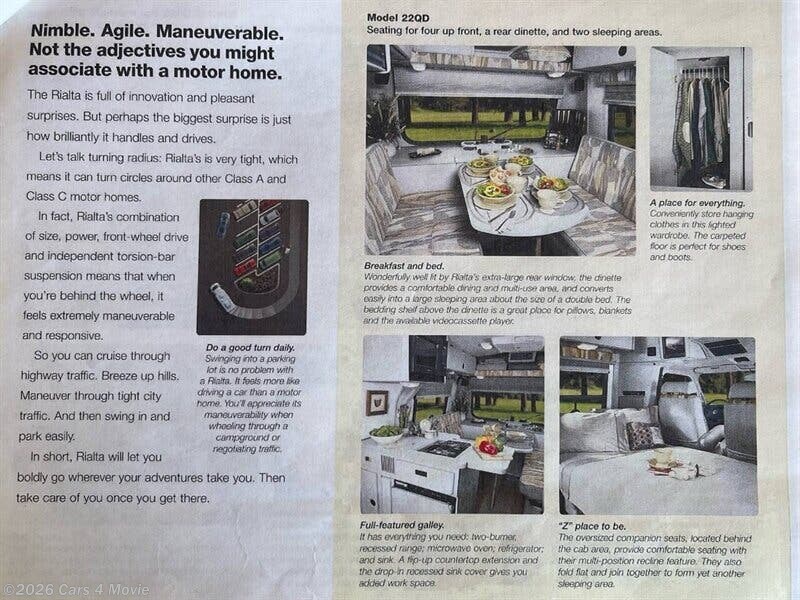 2026 is shaping up to be a great year for Happy campers. We are a family-run business specializing in RVs and specialty vehicles, proudly selling nationwide since 2010 with 100% positive eBay feedback and thousands of satisfied buyers. Every unit completes a 50-point inspection focused on safety, reliability, and overall condition, then is stored in a secured private facility (not a public car lot) until sold. Over 95% of our customers purchase sight-unseen with confidence through our simple, transparent process, which includes FREE nationwide shipping and a 30-day limited warranty, with live FaceTime video call available so buyers can verify authenticity and condition in real time before finalizing the wire. Our family has pioneered RV FREE shipping coast-to-coast for over 14 years, earning a reputation built on trust, transparency, and hassle-free delivery. Rialta 22QD is one of those rare RVs that has become a cult classic, and its popularity continues to rise even years after production ended. My best low miles; Driven less than 2,000 miles a year. no accident no flood CLEAN TITLE CLEAN CARFAX WITH CUSTOM INTERIOR CONVERSION ($5000) for more living space the middle seats are available has roof AC, 3-new batteries, new silent generator, new fresh paint on rear bumper & panels, new tv dvd combo, new backup camera, new oil filter service, recent heavy duty commercial tires, whoever buys this one will end up with my best. The 2002s with new improved more H.P. Winnebago Rialta 22QD remains one of the most sought-after Class B+ motorhomes ever built, and for good reason. The airplane like aluminum body roof is light & rust leak proof, At just 22 feet long, it strikes the perfect balance between comfort and convenience—small enough to handle like a van, yet spacious enough to provide all the amenities of a larger RV. sleeps 2 adults 2 kids… The versatile 22QD floor plan is designed with flexibility in mind. Up front, you’ll find four captain’s chairs that easily convert into a dinette, lounge, or sleeping area, while the rear provides a fold-out full-size bed or sofa for added comfort. A fully equipped kitchenette, wet bath, and generous storage compartments are thoughtfully designed to maximize every inch of space. Whether you’re heading out for a weekend getaway or an extended cross-country adventure, the Rialta is ready to adapt to your needs. A cult favorite among RV enthusiasts thanks to its rare combination of efficiency, smart design, and timeless build quality.
