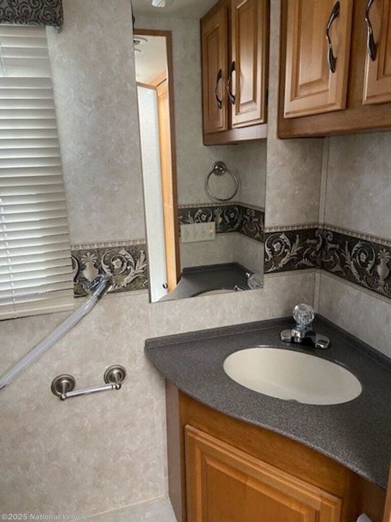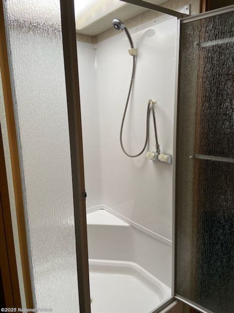 This coach features a bathroom complete with shower, toilet, and a sink with a medicine cabinet above for your convenience.