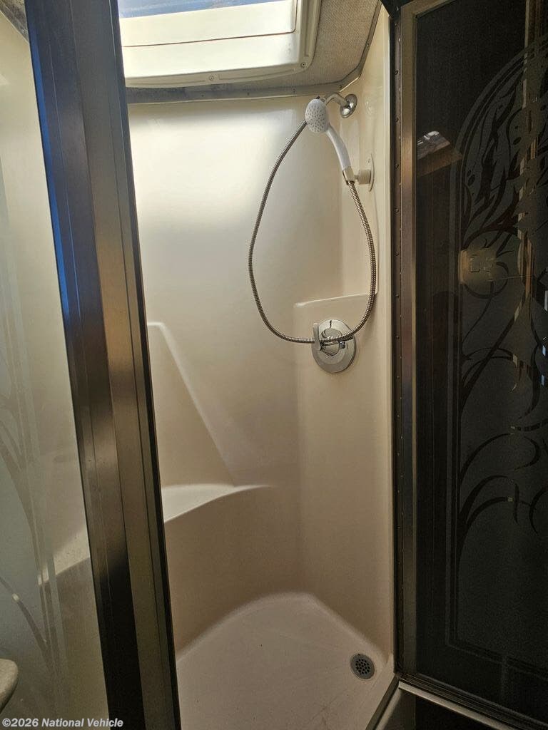 Toward the rear, the private bedroom offers a comfortable walk-around bed, wardrobe storage, and additional cabinets to keep your belongings organized. The bathroom includes a spacious shower, vanity, and toilet, giving you the comfort and privacy of home wherever your travels take you.