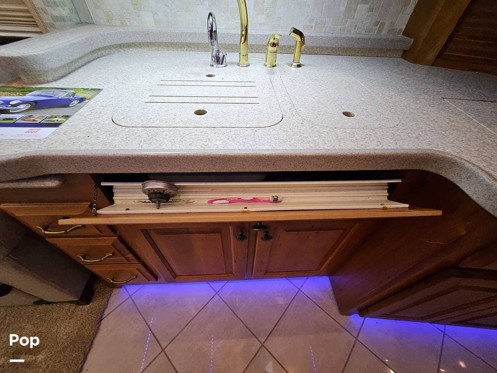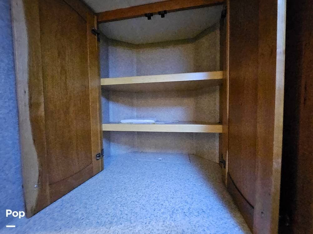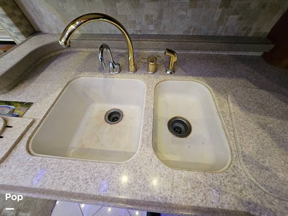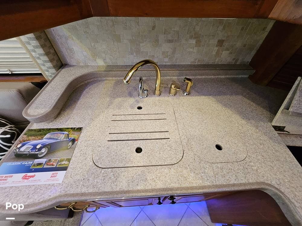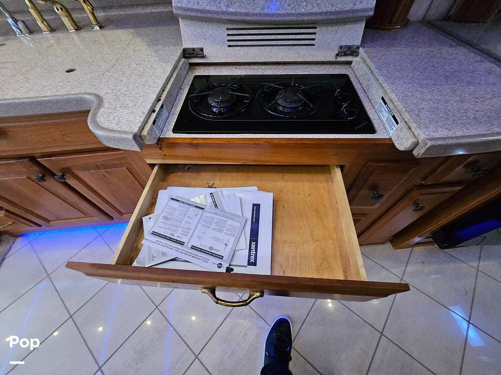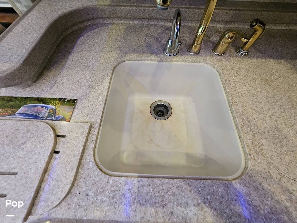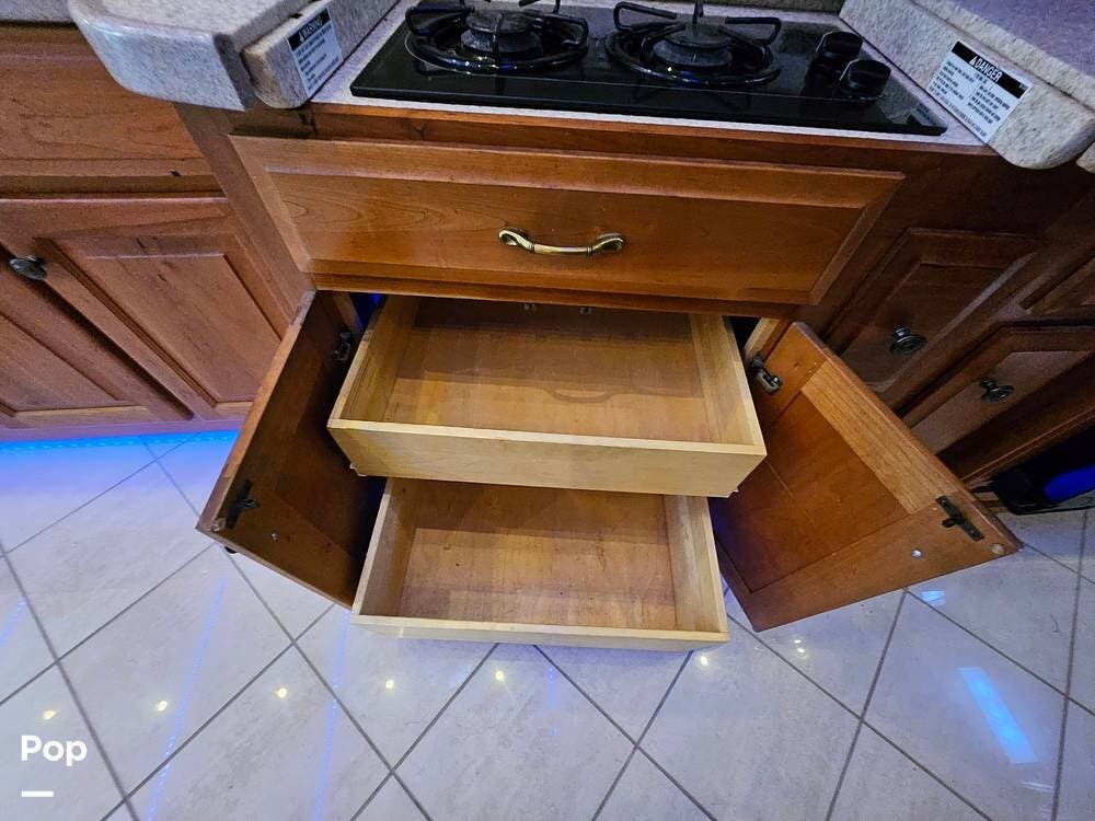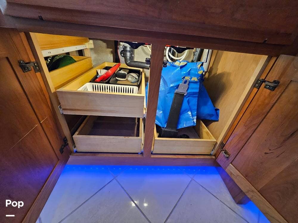 In the mid cabin, you have a pull-out table and two chairs. You also have ample storage with a double sink, a convection microwave, a full-size residential refrigerator, and a two-burner stove.