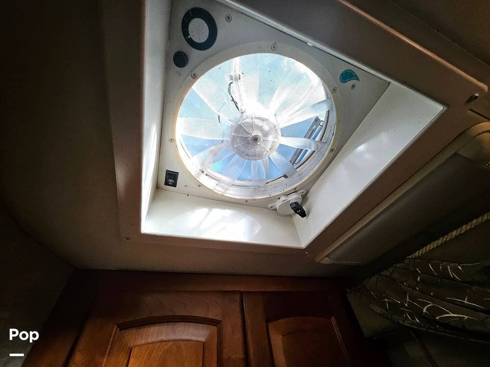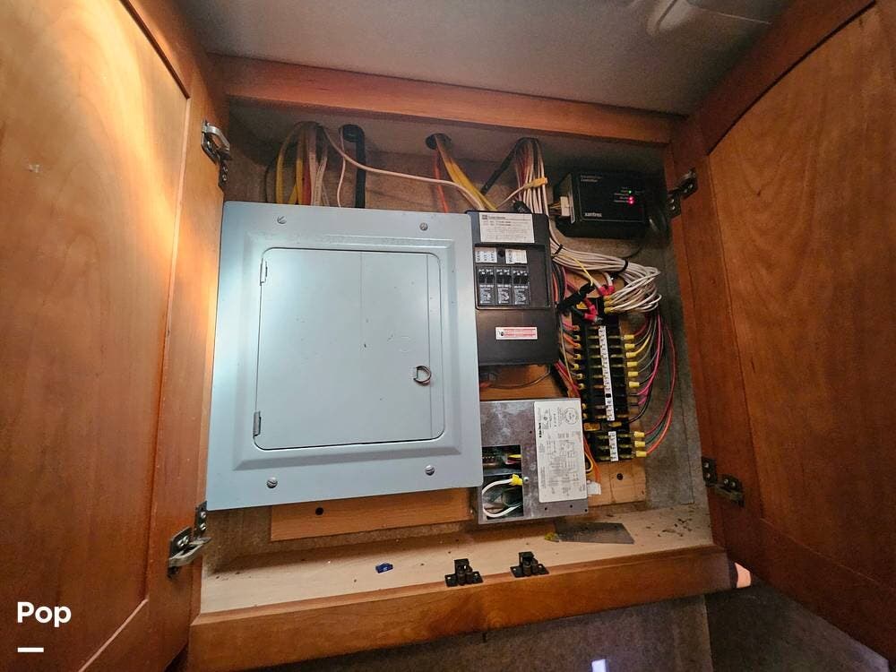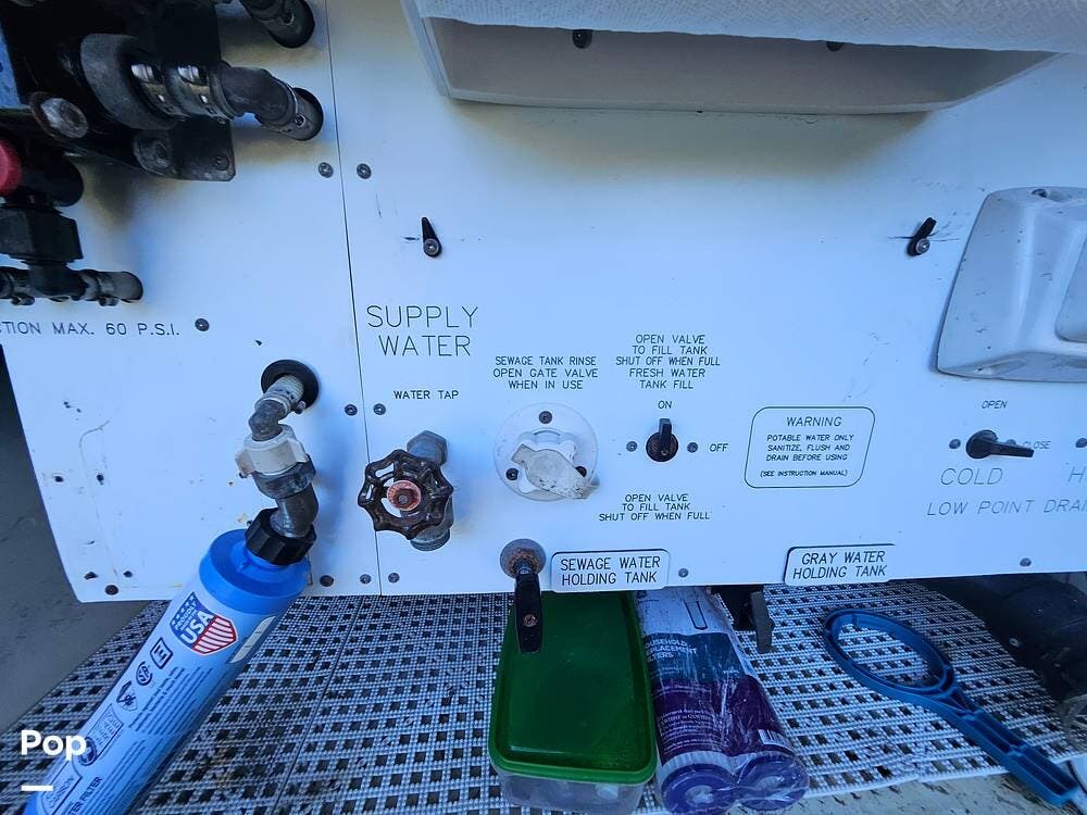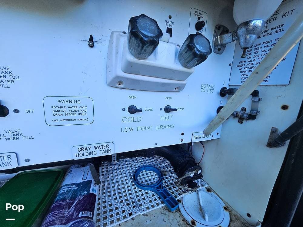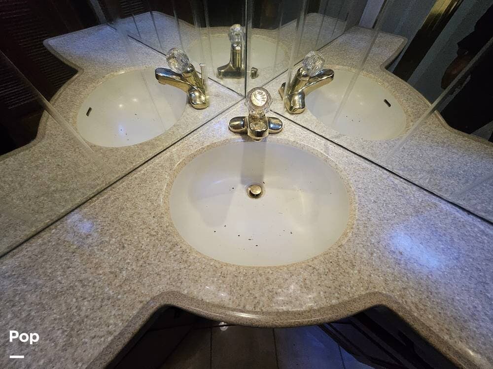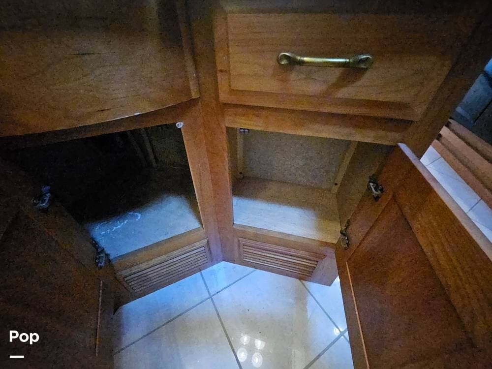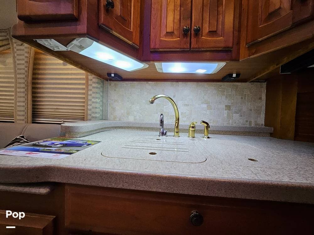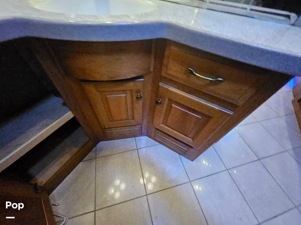 In the mid cabin, you have a pull-out table and two chairs. You also have ample storage with a double sink, a convection microwave, a full-size residential refrigerator, and a two-burner stove.