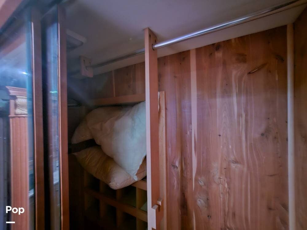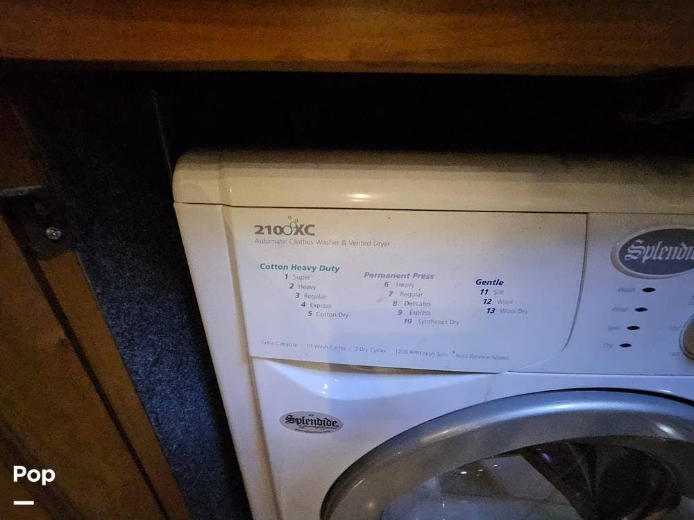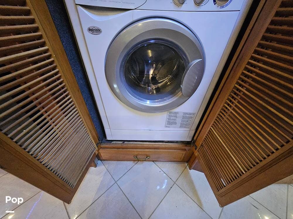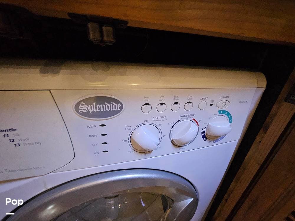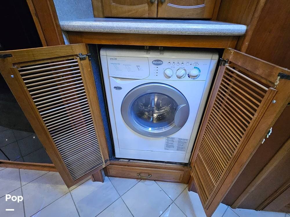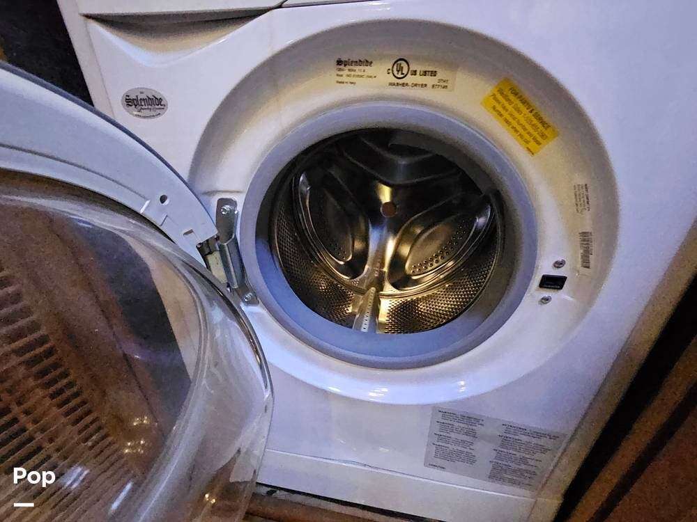 The interior features a king-size bed in the rear, a TV, and just in front of it, a split bathroom with a large shower on one side. In addition, a washer/dryer combo unit for your convenience.