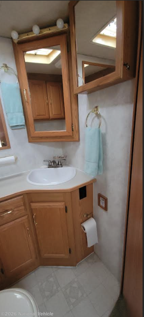 This coach features a bathroom complete with a spacious shower, toilet, and a sink with a medicine cabinet above for your convenience.