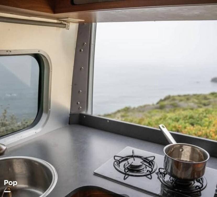Inside, the living area is arranged to maximize space. The sofa converts to a sleeping area and includes overhead cabinets for practical storage. A removable table creates a functional dining or work space. The cabinetry and trim reflect Airstream's clean, practical style, and lighting and outlets are conveniently placed for daily use.