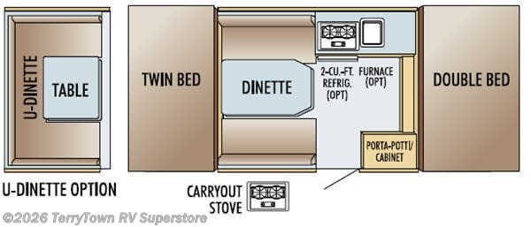Double Slide, Rear Twin Bed Slideout, Booth Dinette, Opt. U Dinette, Carryout 2 Burner Stove, Opt. 2 Cu. Ft. Refrigerator, Opt. Furnace, Porta-Potti/Cabinet, Front Double Bed Slideout, 16 Ft. 3 In. Campsite Length, and Much More!