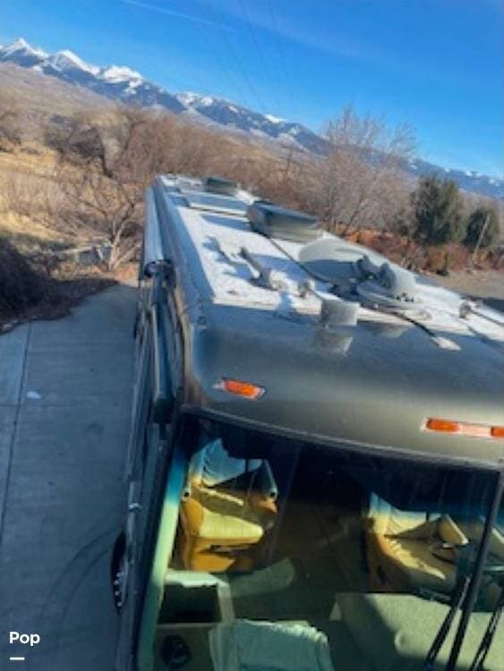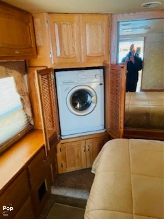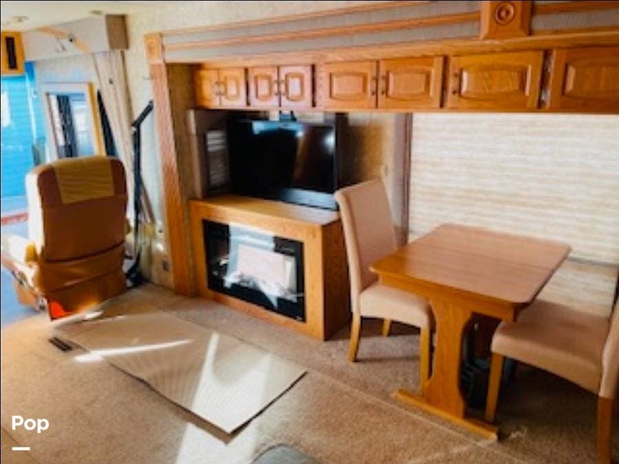 At 40 feet in length, this diesel pusher comes fully equipped with a fireplace, dining table and chairs, washer and dryer, solar panels, and more!