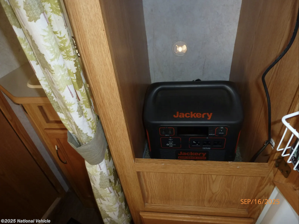 Appliances: Includes a double basin sink, a stovetop with oven, a microwave hood, and a 110 volt refrigerator/freezer (runs off of the Jackery 1500 watt solar generator).