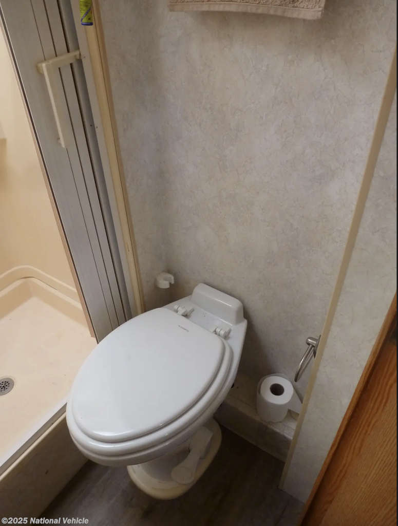Fixtures: A stand-up shower with a skylight, an RV toilet, a bathroom sink, and nice plumbing fixtures.