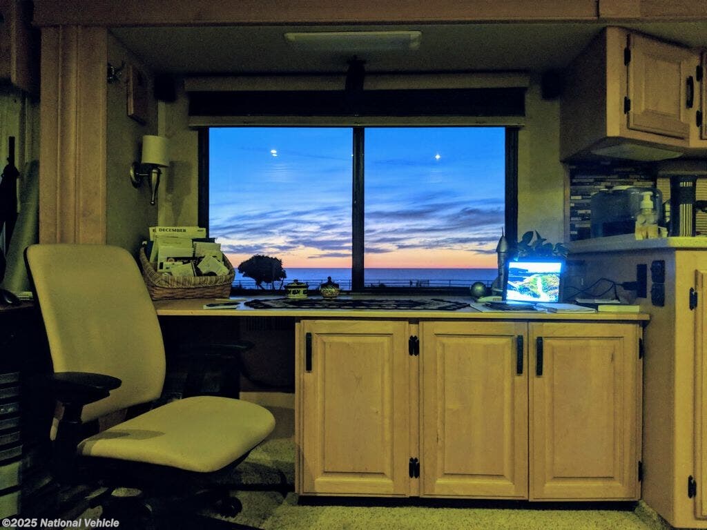 Step inside and take a look back at all of the convenient features that would make any journey enjoyable. The kitchen area features everything you need to prepare great meals on the go including a sink, a three burner range with microwave/convection oven, and a Norcold 1200 electric/propane RV refrigerator/freezer. There is also plenty of storage for all of your dry and canned goods. Have a seat at the comfortable dinette, where you can enjoy meals with your family. At night the dinette can transform into sleeping space for family or overnight guests.
