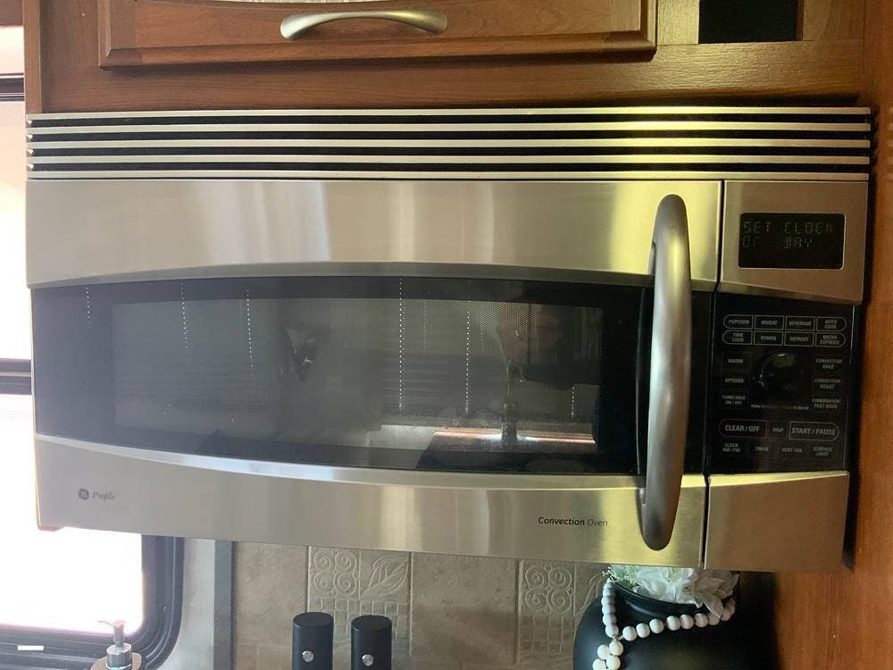 A three-burner stove, convection microwave oven, and large double-door refrigerator. The galley kitchen is designed with functionality and storage in mind, suitable for extended stays and full-time living.