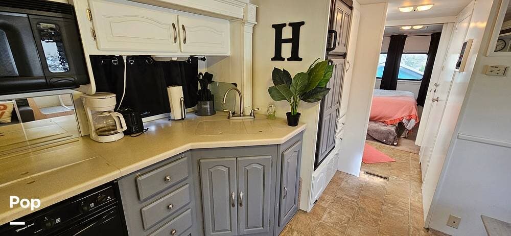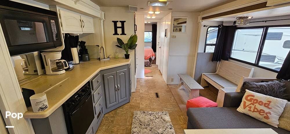 The triple slide layout provides an incredibly open floor plan, giving you plenty of room to relax or entertain. The living space flows seamlessly into a well-appointed kitchen featuring updated surfaces, ample cabinetry, and generous counter space -- perfect for extended trips or full-time RV living. The attention to detail in the renovation makes this coach feel clean, cohesive, and move-in ready.