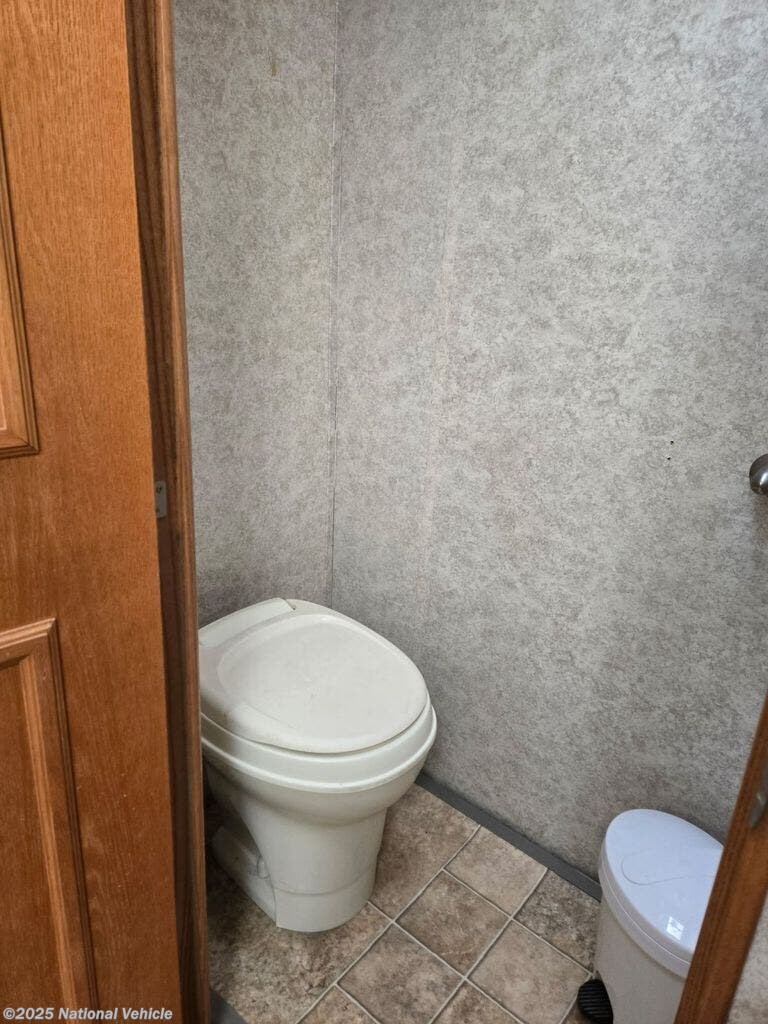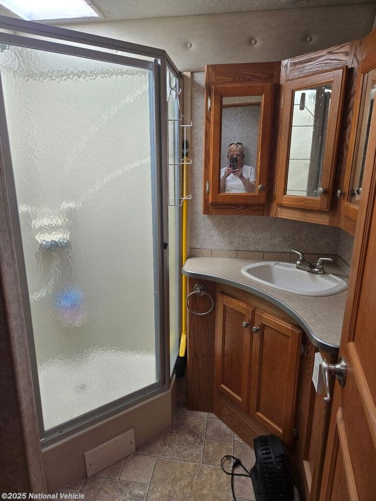 This coach features a bathroom complete with shower, toilet, and a sink with a medicine cabinet above for your convenience.