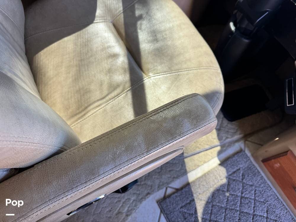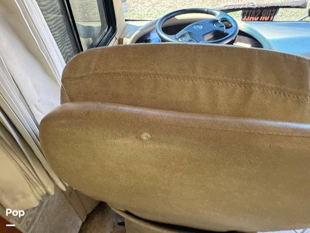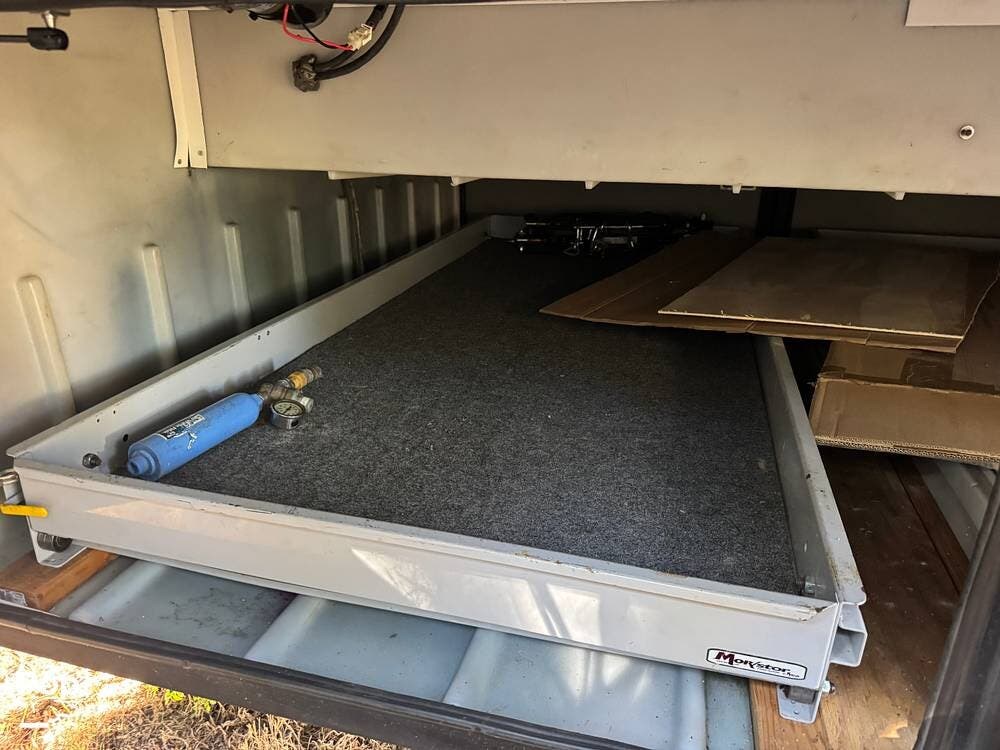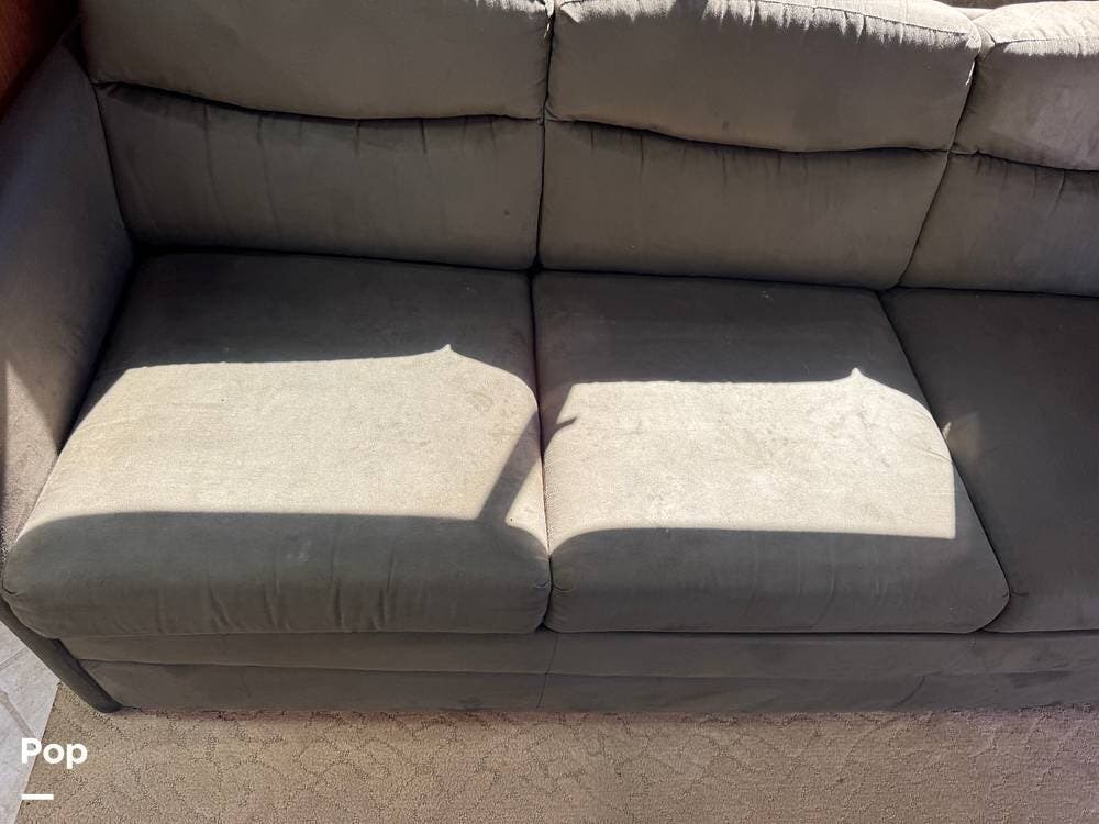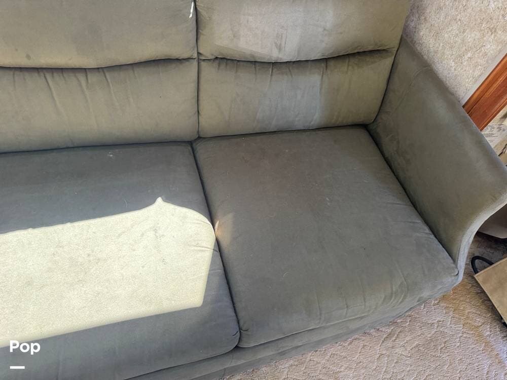 The main living area features a sofa sleeper (with an inflatable mattress), the front chairs swivel to become part of the seating area, and large windows that provide ample ambient light and great views from inside the coach. The furniture in the slide-out area with the large windows has been removed, so you can put whatever you want in there, either stadium style recliners, and additional sleeper sofa, or a dining area, whatever you choose, you have an open canvas.