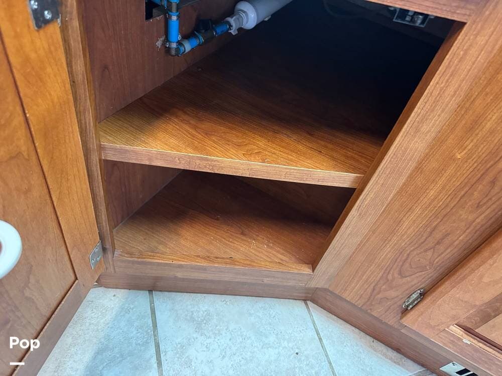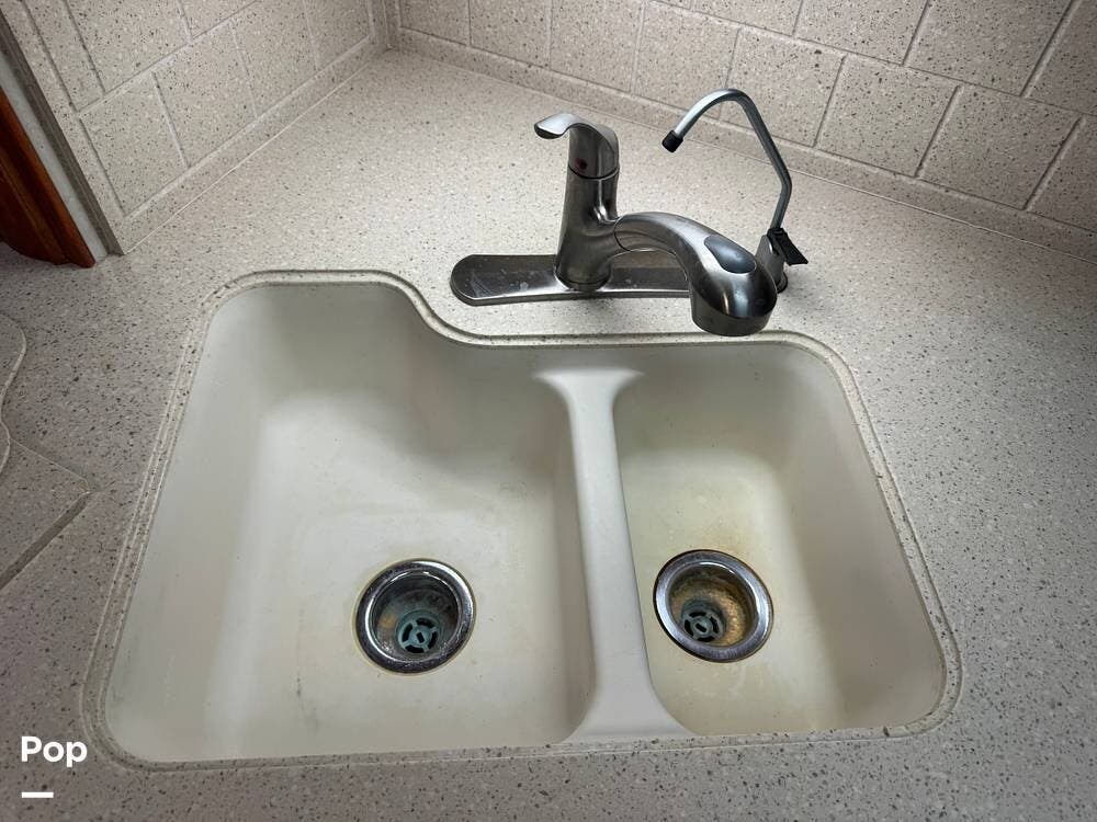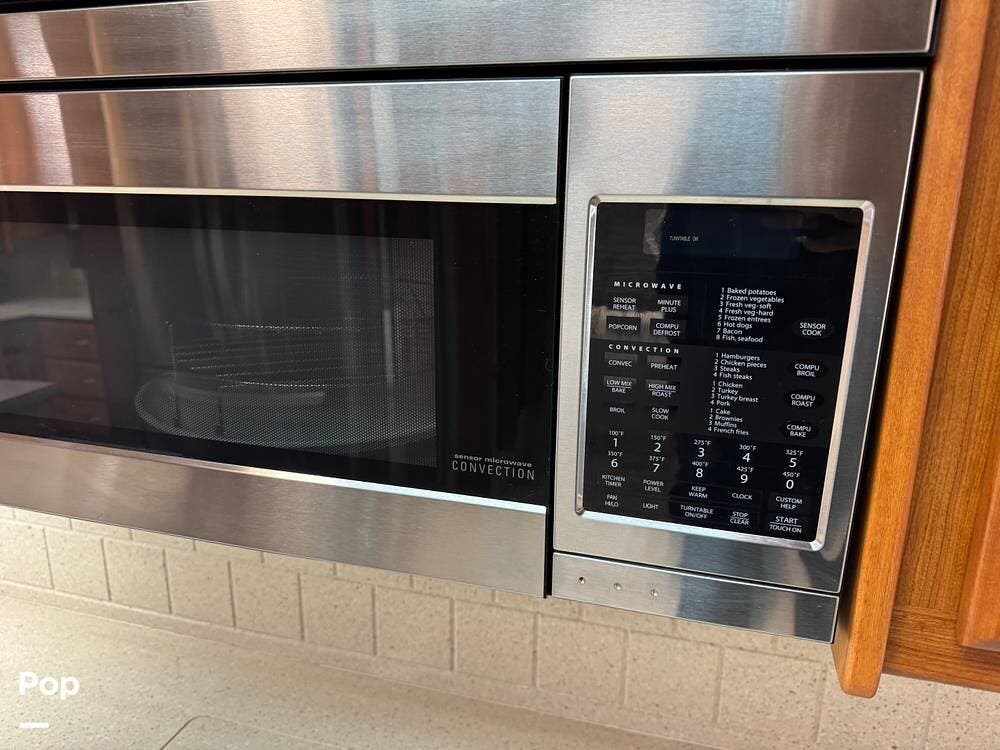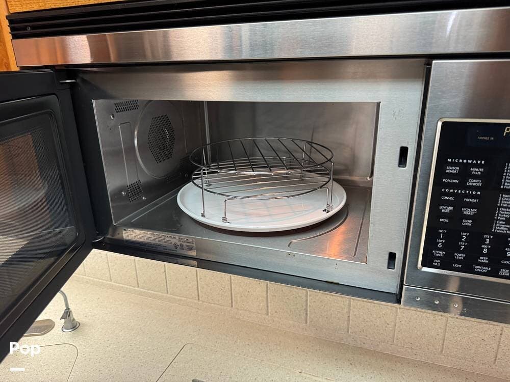 The kitchen area has ample storage, including an additional pantry. It also features a double kitchen sink and a three-burner stove (both with covers), a convection microwave oven, a full-sized refrigerator with a separate freezer compartment, and plenty of room to move around.