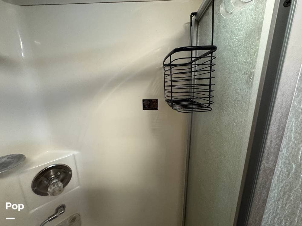 The shower and bathroom are on one side of the coach, and the vanity and sink areas are across the hall, making it easy for two people to get ready in the morning and giving them the space to do so.