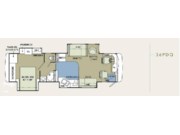 The main living area features a power reclining love seat and two individual recliners and a dining room table with chairs. Sit back and enjoy a meal and the TV above the forward cab area.