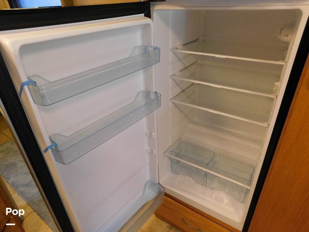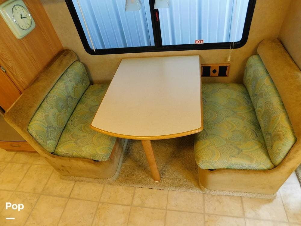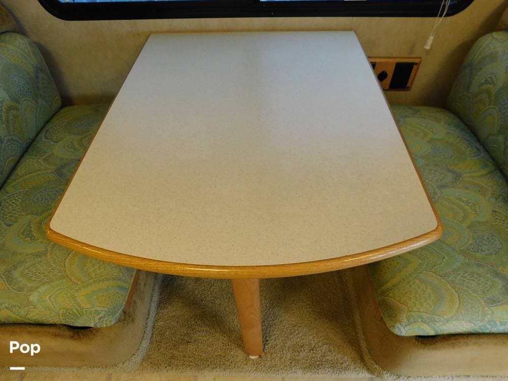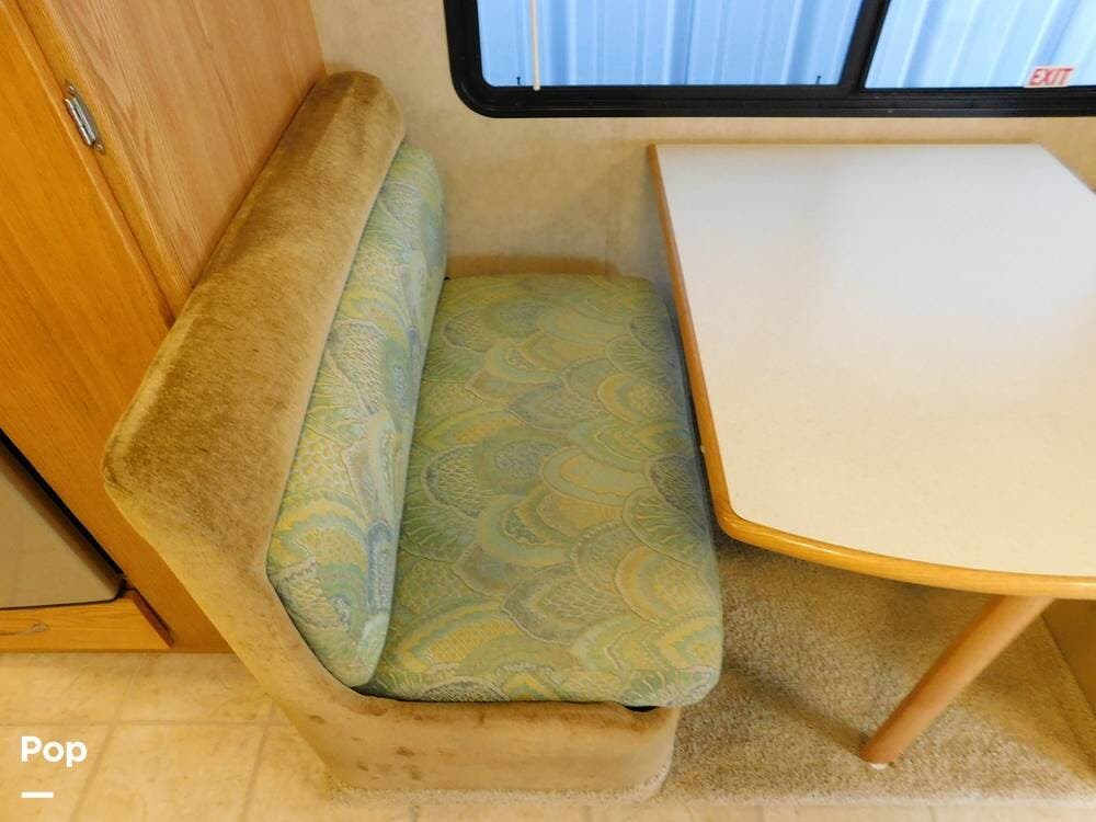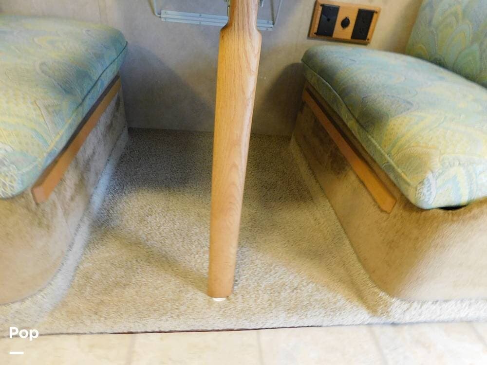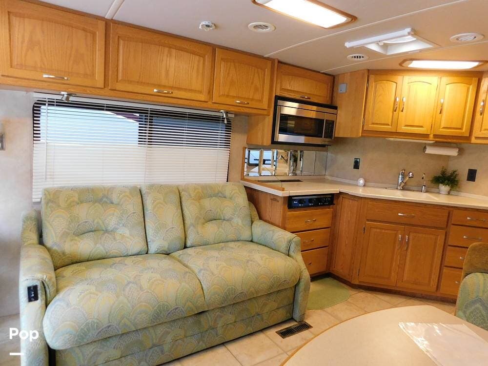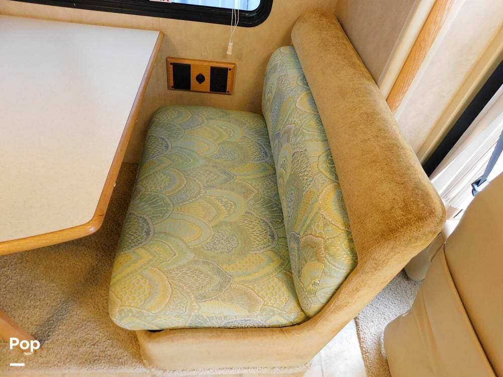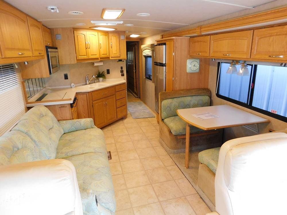 Upon entering the Meridian 32T, you are greeted by an inviting and thoughtfully laid-out interior. The living area is equipped with a reupholstered convertible sofa and a dinette providing the perfect space to relax or entertain guests. Large panoramic windows flood the space with natural light and offer scenic views during travel and at campgrounds.