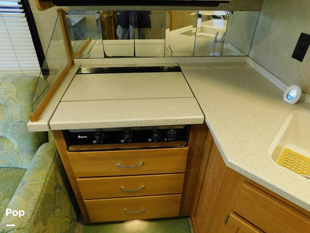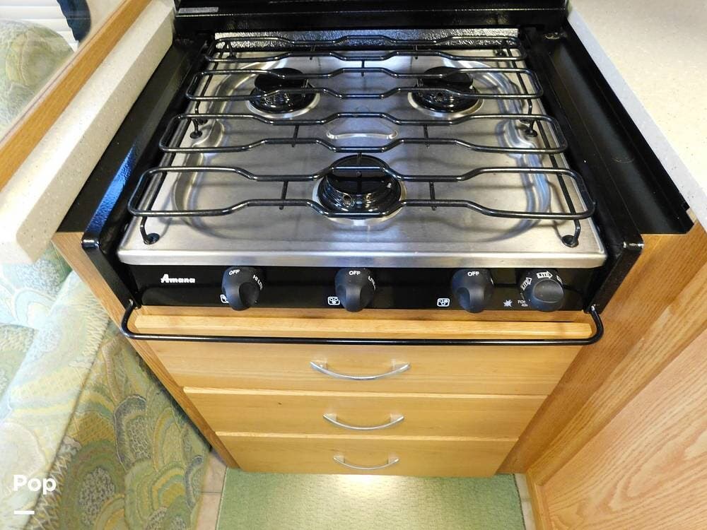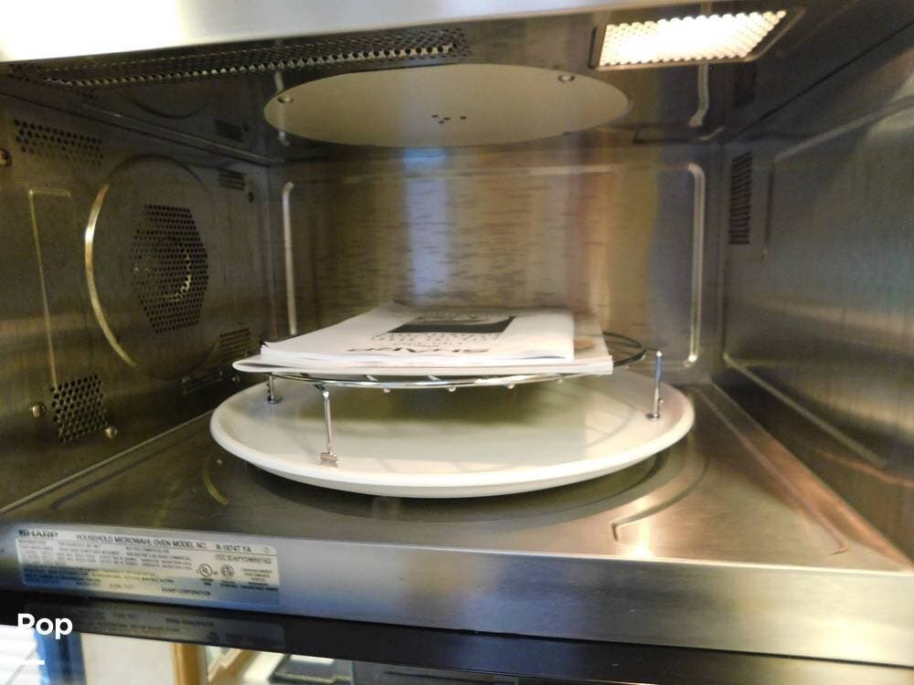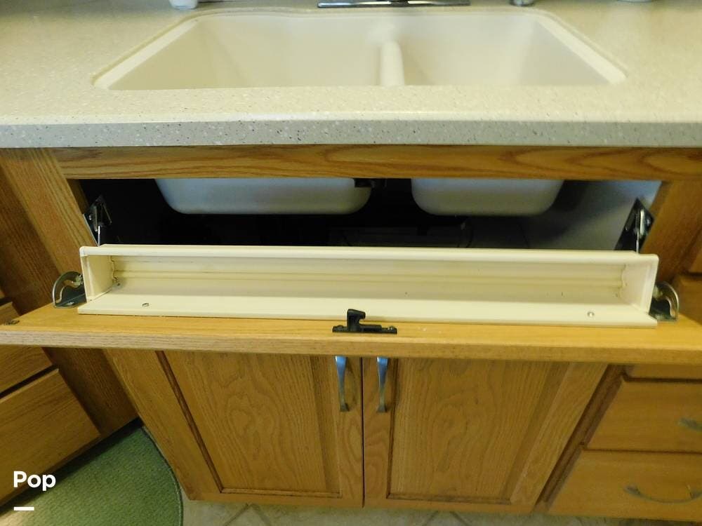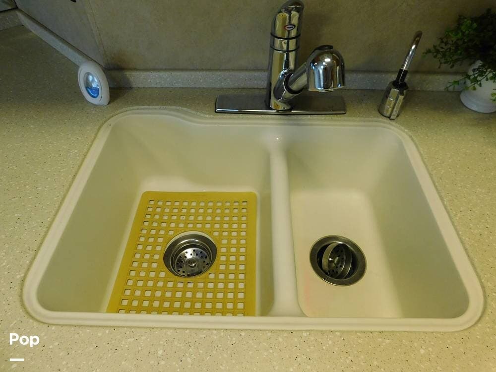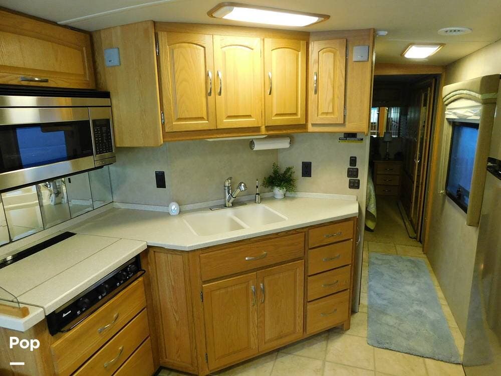The kitchen is designed with efficiency and convenience in mind, featuring solid-surface countertops, a residential-style double sink, a three-burner stovetop, a convection microwave, and a mid-sized refrigerator. Generous cabinetry and pantry space ensure that all cooking essentials and groceries are easily accessible.