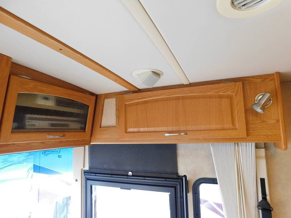 The rear bedroom has a queen-sized bed, overhead cabinets, a TV, and bedside storage. The bedroom is separated from the main living space, offering privacy and comfort. The layout includes wardrobe closets and additional drawers for clothing and personal items, catering to extended stays on the road.