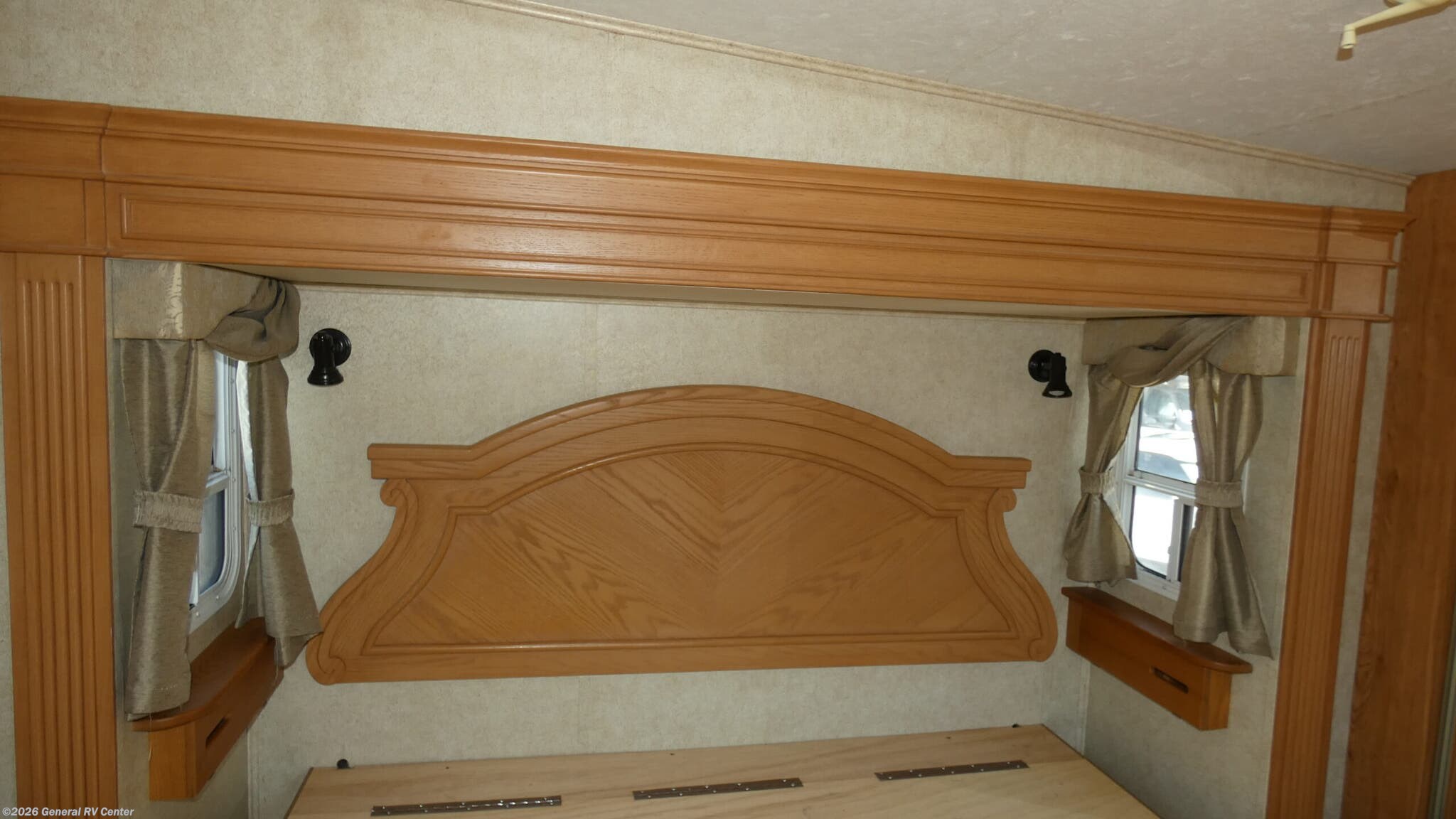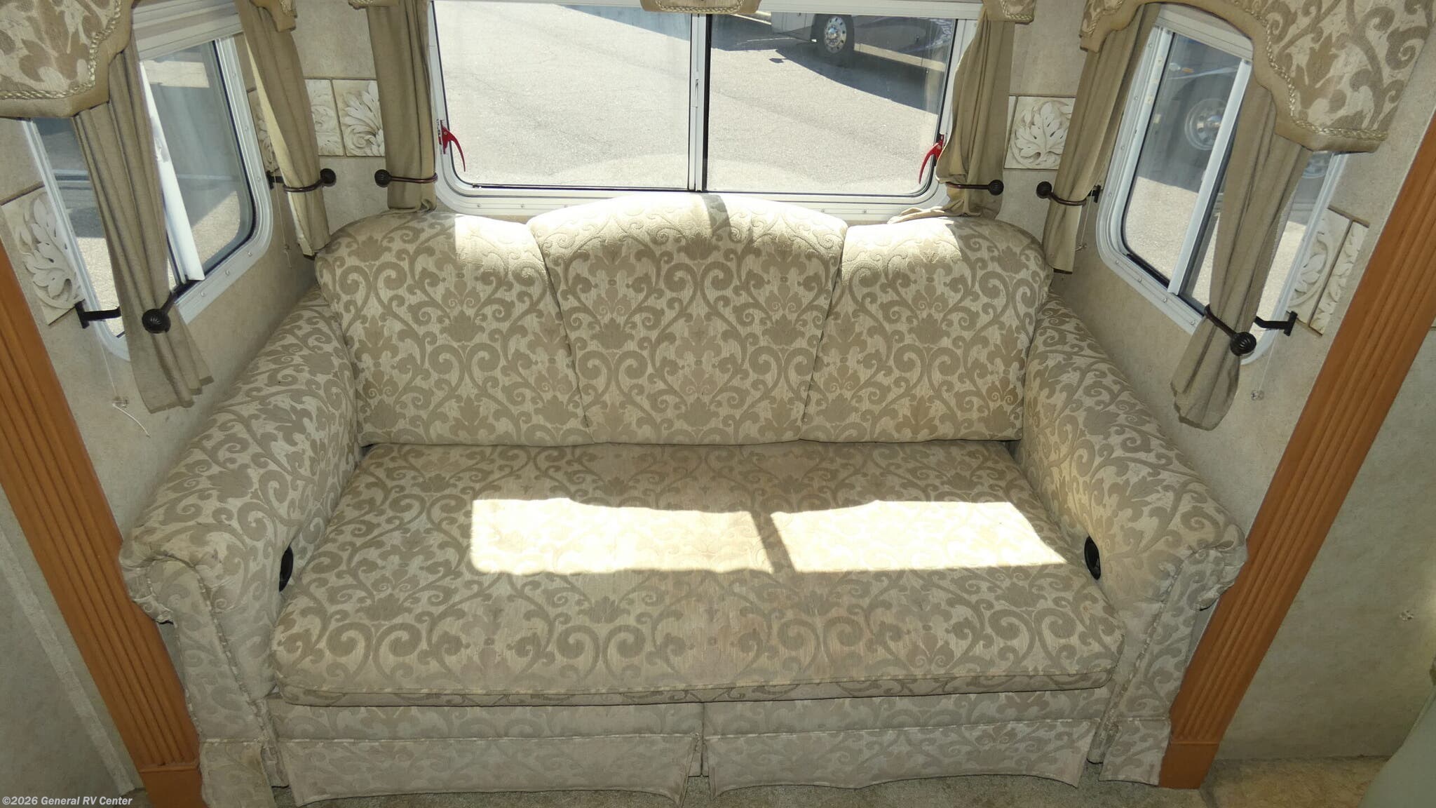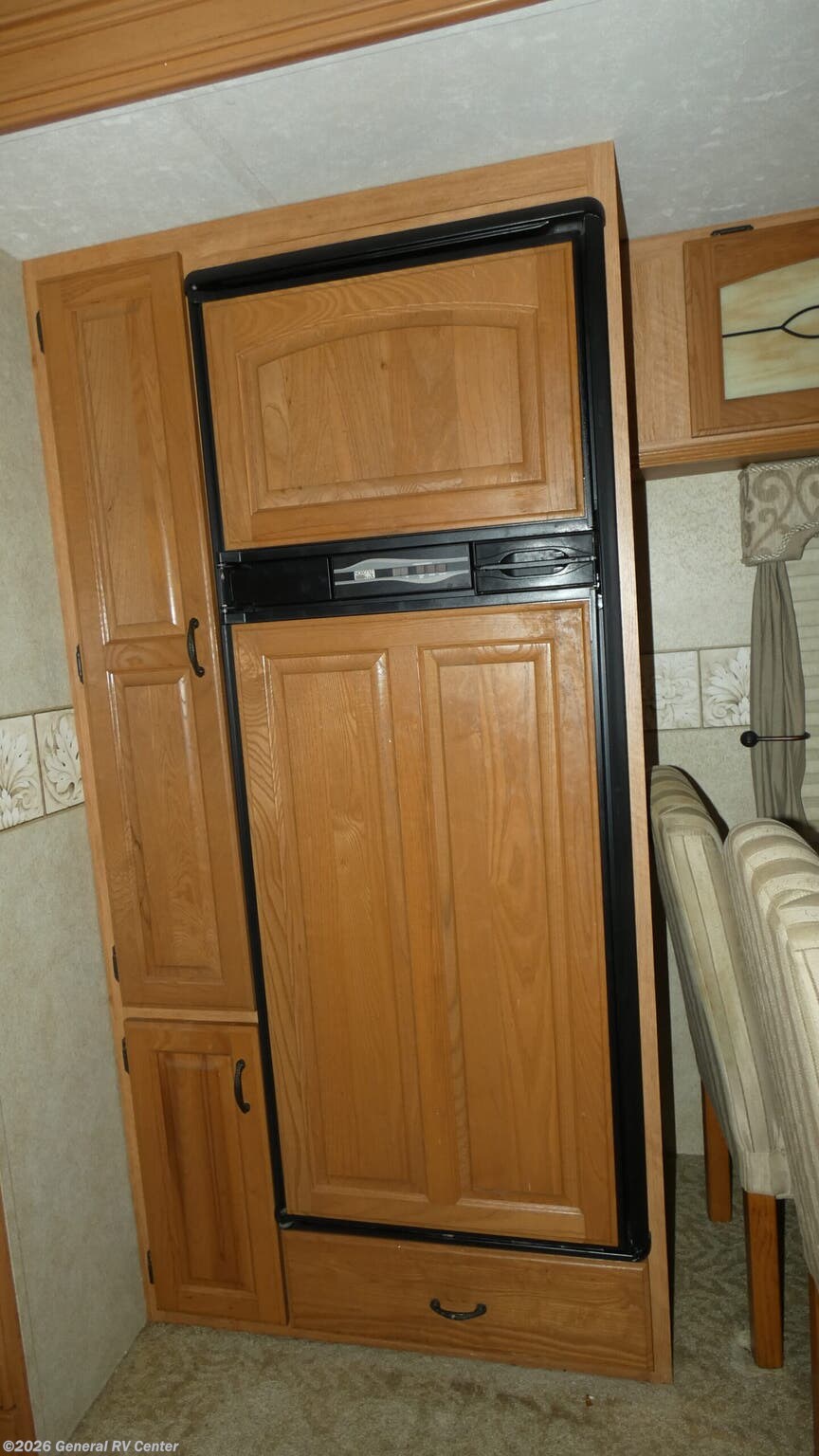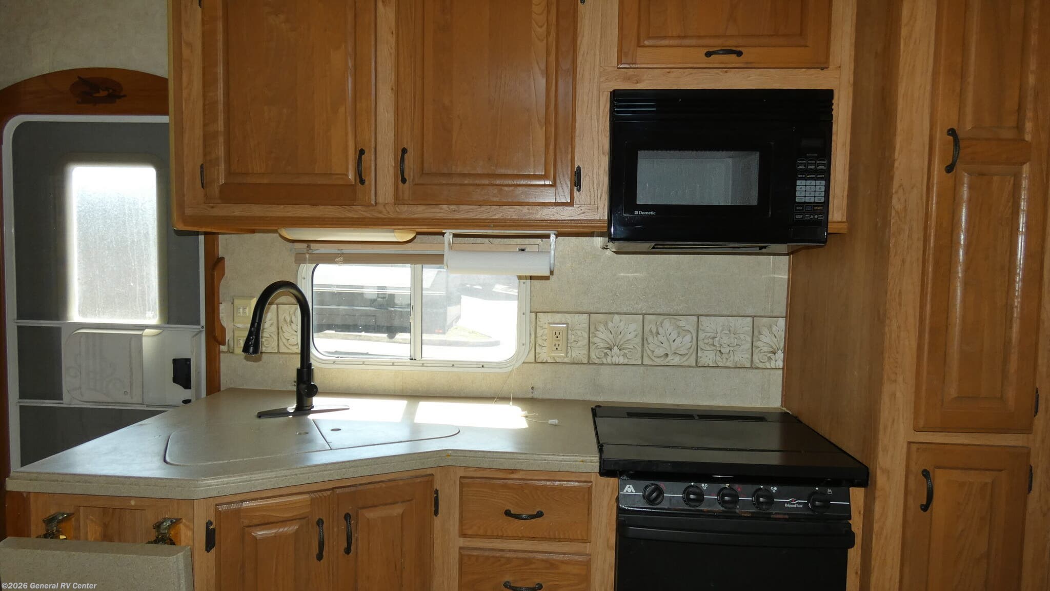Step into comfort and smart design with this well-appointed fifth wheel featuring a spacious rear living layout and a private front bedroom. The rear living area is designed for relaxation and entertaining, offering dual lounge chairs, a comfortable hide-a-bed sofa for overnight guests, and an entertainment center with overhead cabinetry for ample storage. Large windows create an open, inviting atmosphere with great natural light. The centrally located kitchen is fully equipped with a refrigerator, microwave, range, and generous counter space, along with abundant overhead cabinets for storage. The adjacent free-standing dinette and chairs provide a comfortable space for dining, working, or gathering with friends and family. Up the steps, you’ll find a full bathroom featuring a shower, vanity, toilet, and convenient linen storage. The private front bedroom offers a king-size bed, large wardrobe, and additional cabinetry to keep everything organized and accessible. With thoughtful storage throughout, a functional layout, and comfortable sleeping space for guests, this fifth wheel is ideal for extended stays, seasonal camping, or full-time RV living. Don’t miss the opportunity to own a fifth wheel that combines residential comfort with on-the-road flexibility.