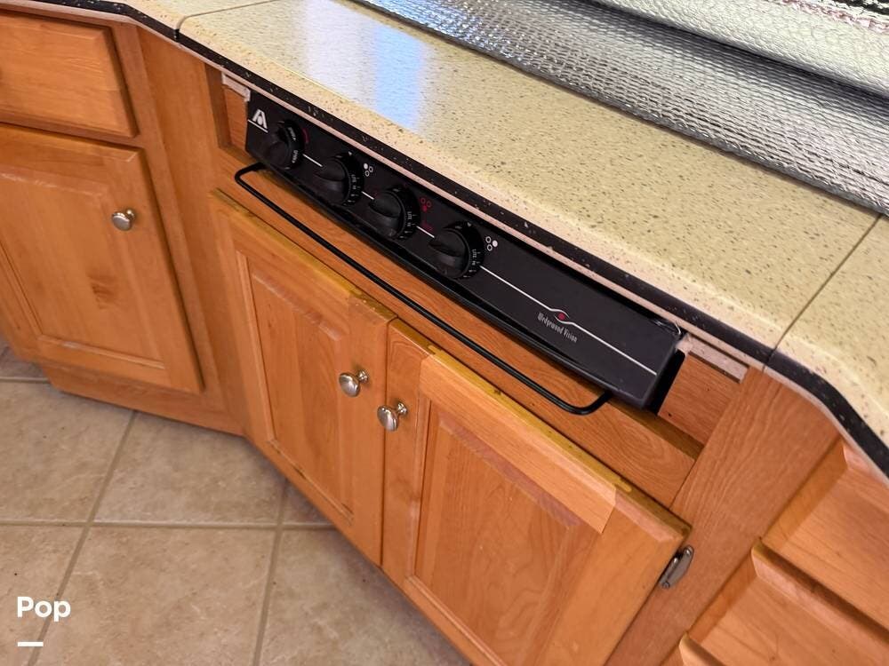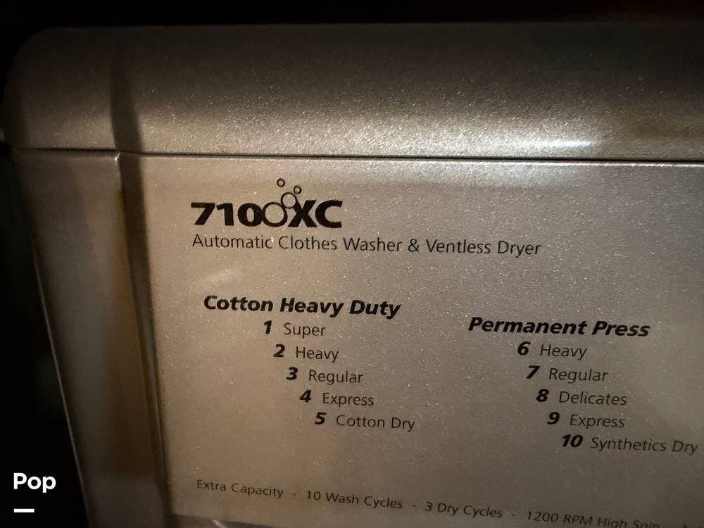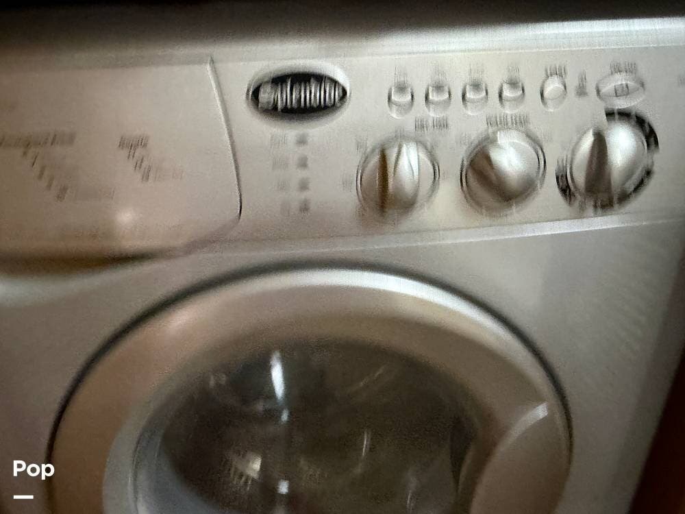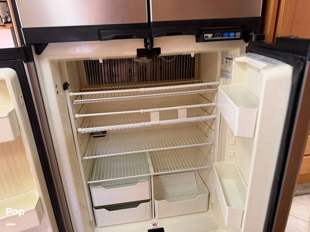 The kitchen is well-equipped with solid-surface countertops, a residential-style refrigerator, a convection microwave, and ample storage. The private rear bedroom includes a walk-around queen bed, generous wardrobe space, and washer/dryer hookups.