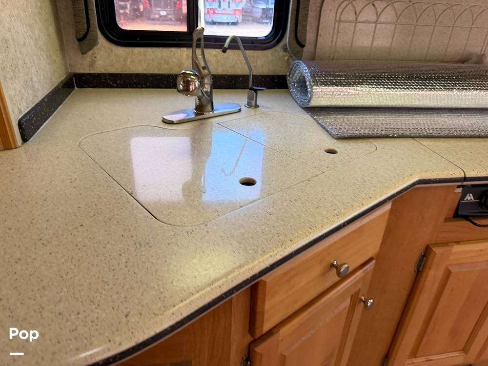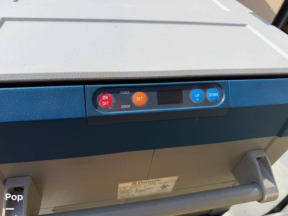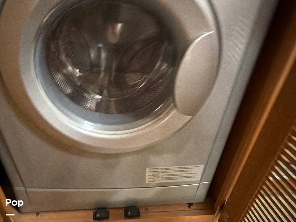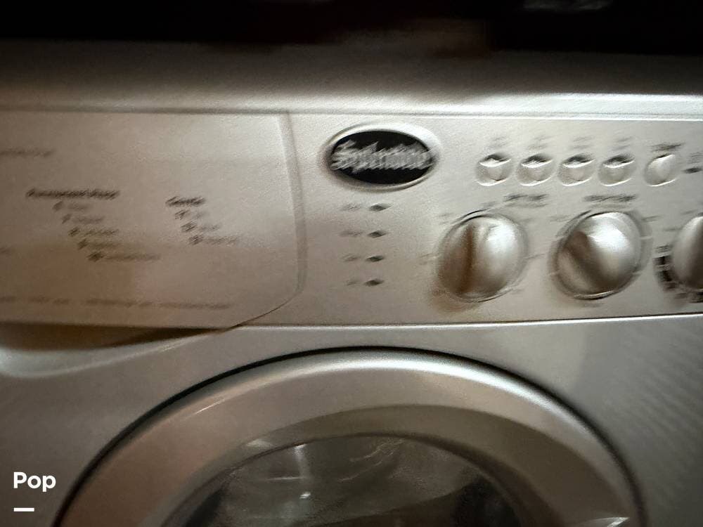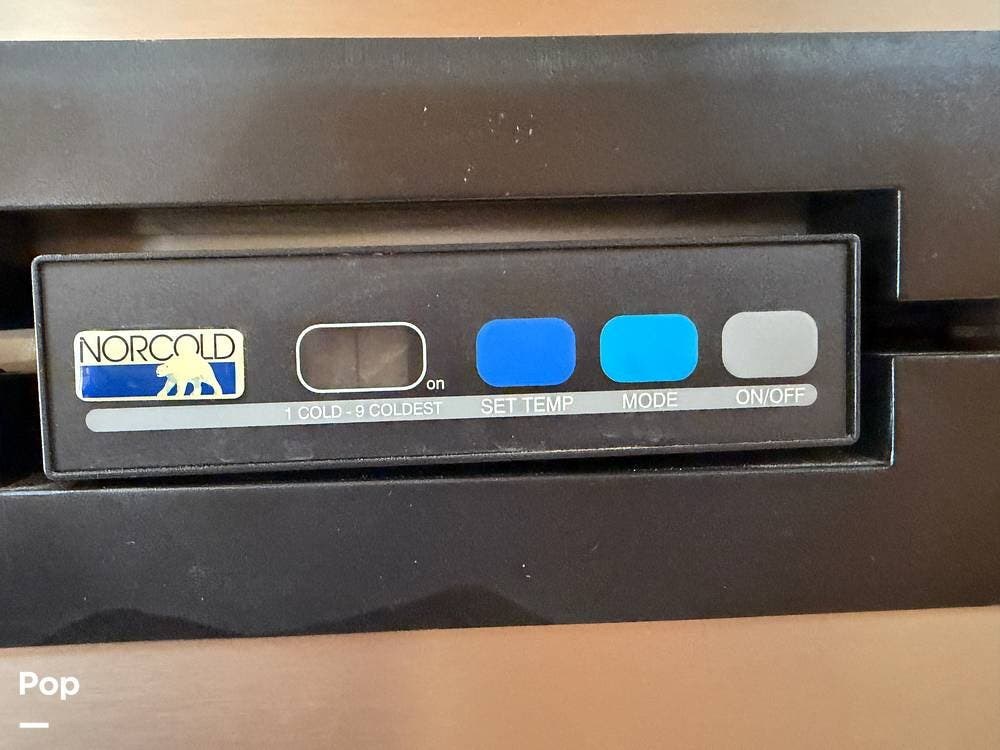 The kitchen is well-equipped with solid-surface countertops, a residential-style refrigerator, a convection microwave, and ample storage. The private rear bedroom includes a walk-around queen bed, generous wardrobe space, and washer/dryer hookups.